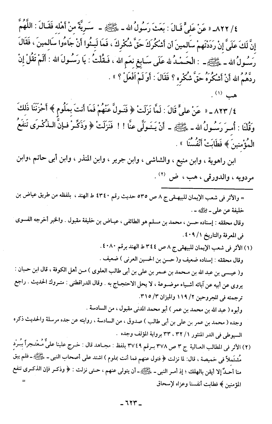 4/ 822 - "عَنْ عَلِىٍّ قَالَ: بَعَثَ رَسُولُ الله - صلى الله عليه وسلم - سَرِيَةً مِنْ أَهْلِهِ فَقَالَ: اللَّهُمَّ إِنَّ لَكَ عَلَىَّ إِنْ رَدَدْتَهمْ سَالمينَ أن أَشْكُرَكَ حَقَّ شُكْرِكَ، فَمَا لَبثُوا أَنْ جَاءُوا سَالِمينَ، فَقَالَ رَسُولُ الله - صلى الله عليه وسلم -: الحَمْدُ لله عَلَى سَابِغ نِعَم الله، فَقُلتُ: يَا رَسُولَ الله: أَلَمْ تَقُلْ إِنْ ردَّهُمُ الله أَنْ أَشكرَهُ حَقَّ شُكْرِهِ؟ فَقَالَ: أَوَ لَمْ أَفْعَلْ؟ ".