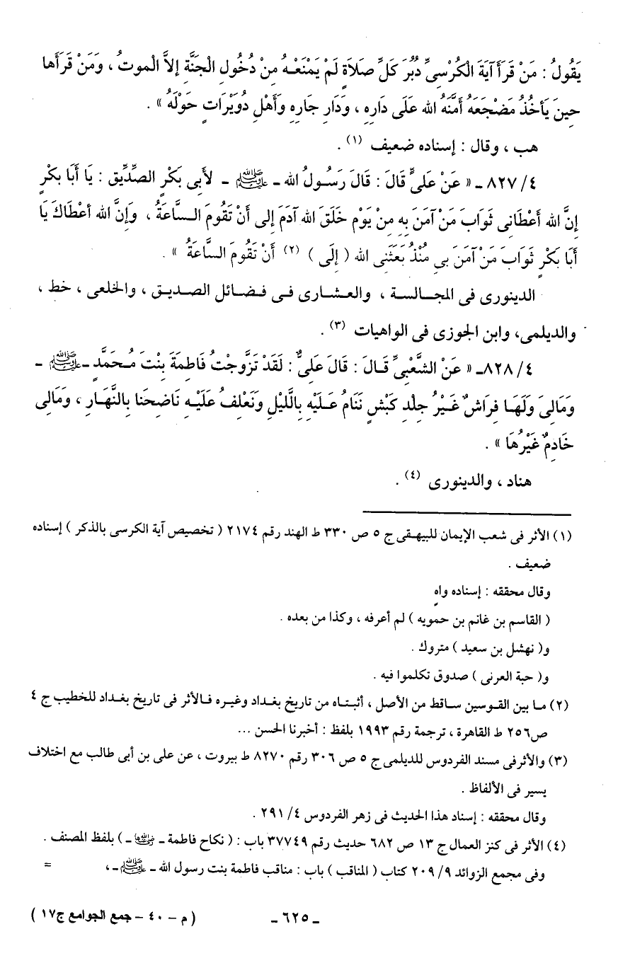 4/ 828 - "عَنْ الشَّعْبِيِّ قَالَ: قَالَ عَلِىٌّ: لَقَدْ تَزَوجْتُ فَاطِمَةَ بِنْتَ مُحَمَّدٍ - صلى الله عليه وسلم - وَمَا لِىَ وَلَهَا فِرَاشٌ غَيْرُ جِلدِ كَبْشٍ نَنَامُ عَلَيْهِ بِالَّليْلِ وَنَعْلِفُ عَلَيْهِ نَاضِحَنا بِالنَهَاَّرِ، وَمَا لِى خَادِم غيْرُهَا".