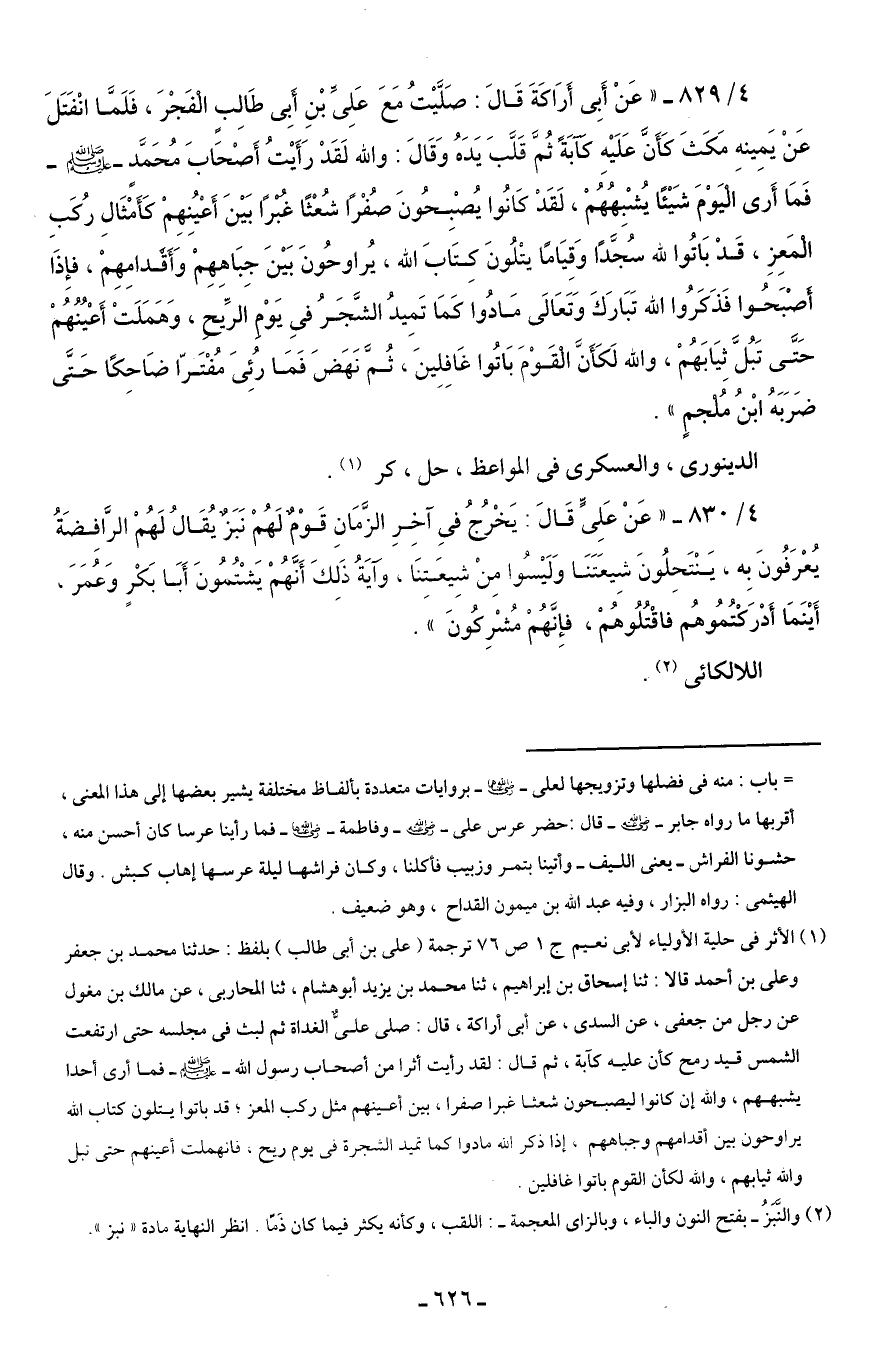 4/ 829 - "عَنْ أَبِى أَرَاكَةَ قَالَ: صَلَّيْتُ مَعَ عَلِىِّ بْنِ أَبِى طَالِبٍ الْفَجْرَ، فَلَمَّا انْفَتَلَ عَنْ يَمِينهِ مَكَثَ كَأَنَّ عَلَيْهِ كآبَةً ثُمَّ قَلَّبَ يَدَهُ وَقَالَ: والله لَقَدْ رَأَيْتُ أَصْحَابَ مُحَمَّدٍ - صلى الله عليه وسلم - فَمَا أَرى الْيَوْمَ شَيْئا يُشْبِهُهُمْ، لَقَدْ كَانُوا يُصْبِحُونَ صُفْرًا شُعْثًا غُبْرًا بَيْنَ أَعْيُنِهِمْ كَأَمْثَالِ ركُبِ الْمَعِزِ، قَدْ بَاتُوا لله سُجَّدًا وَقِيَامًا يتْلُونَ كِتَّابَ الله، يُراوحُونَ بَيْنَ جِبَاهِهِمْ وَأَقَّدامِهِمْ، فإِذَا أصْبَحُوا فَذَكَرُوا الله تَبَارَكَ وَتَعَالَى مَادُوا كَمَا تَمِيدُ الشَّجَرُ في يَوْمِ الرِّيح، وَهَمَلَتْ أَعْيُنُهُمْ حَتَّى تَبُلَ ثيَابَهُمْ، والله لَكَأَنَّ الْقَوْمَ بَاتُوا غَافِلِينَ، ثُمَّ نَهَضَ فَمَا رُئِىَ مُفْتَرًا ضَاحكًا حَتَّى ضَرَبَهُ ابْنُ مُلجمٍ".