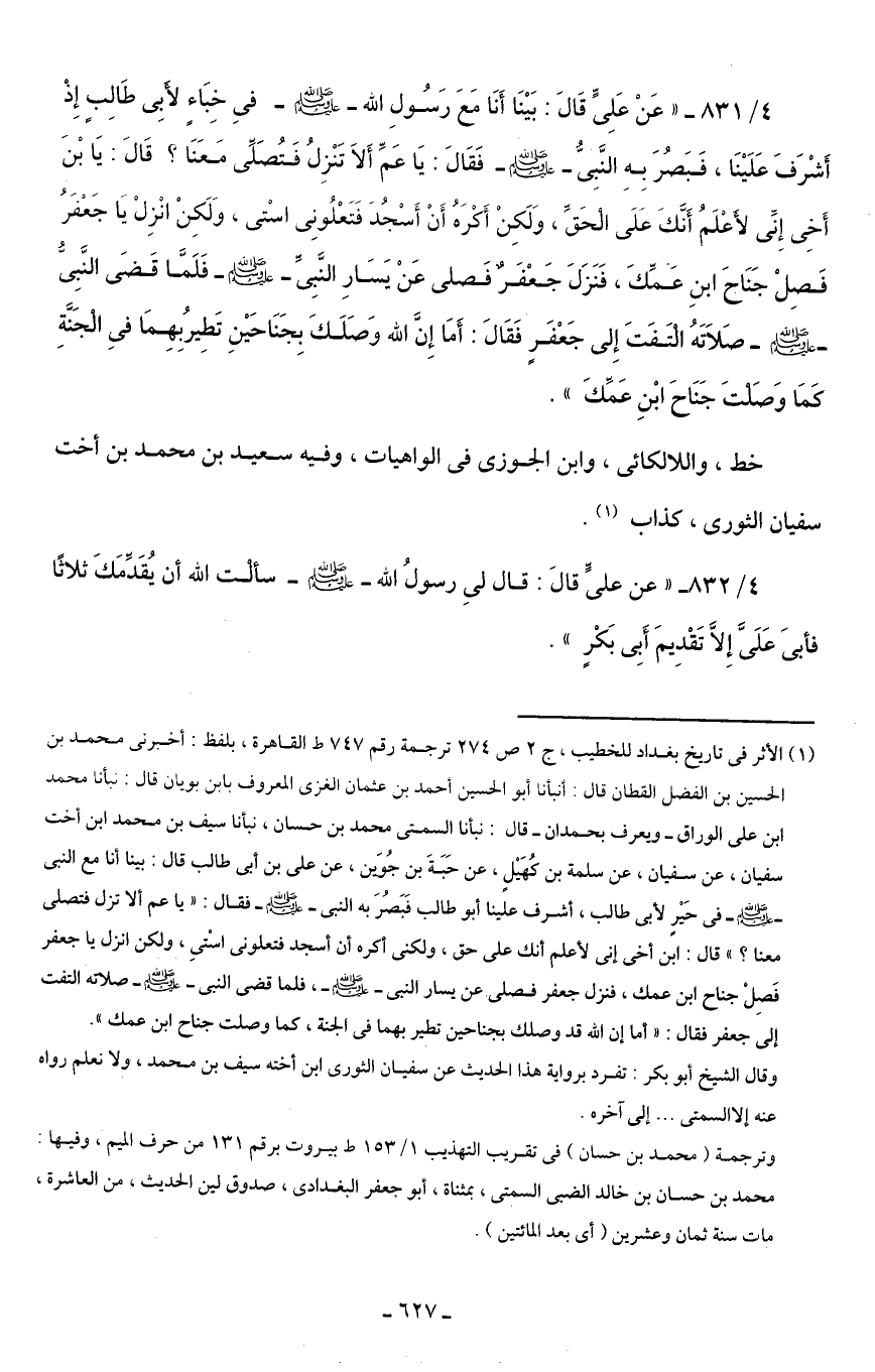 (¬1) الأثر في تاريخ بغداد للخطيب، ج 2 ص 274 ترجمة رقم 747 ط القاهرة، بلفظ: أخبرنى محمد بن الحسين بن الفضل القطان قال: أنبأنا أبو الحسين أحمد بن عثمان الغزى المعروف بابن بويان قال: نبأنا محمد ابن علي الوراق - ويعرف بحمدان - قال: نبأنا السمتى محمد بن حسان، نبأنا سيف بن محمد ابن أخت سفيان، عن سفيان، عن سلمة بن كُهَيْل، عن حَبَةَ بن جُوَين، عن علي بن أبى طالب قال: بينا أنا مع النبى - صلى الله عليه وسلم - في حَيْرٍ لأبى طالب، أشرف علينا أبو طالب فَبَصُرَ به النبى - صلى الله عليه وسلم - فقال: "يا عم ألا تنزل فتصلى معنا؟ " قال: ابن أخى إنى لأعلم أنك على حق، ولكنى أكره أن أسجد فتعلونى اسْتىِ، ولكن انزل يا جعفر فَصِلْ جناح ابن عمك، فنزل جعفر فصلى عن يسار النبى - صلى الله عليه وسلم -، فلما قضى النبى - صلى الله عليه وسلم - صلاته التفت إلى جعفر فقال: "أما إن الله قد وصلك بجناحين تطير بهما في الجنة، كما وصلت جناح ابن عمك".