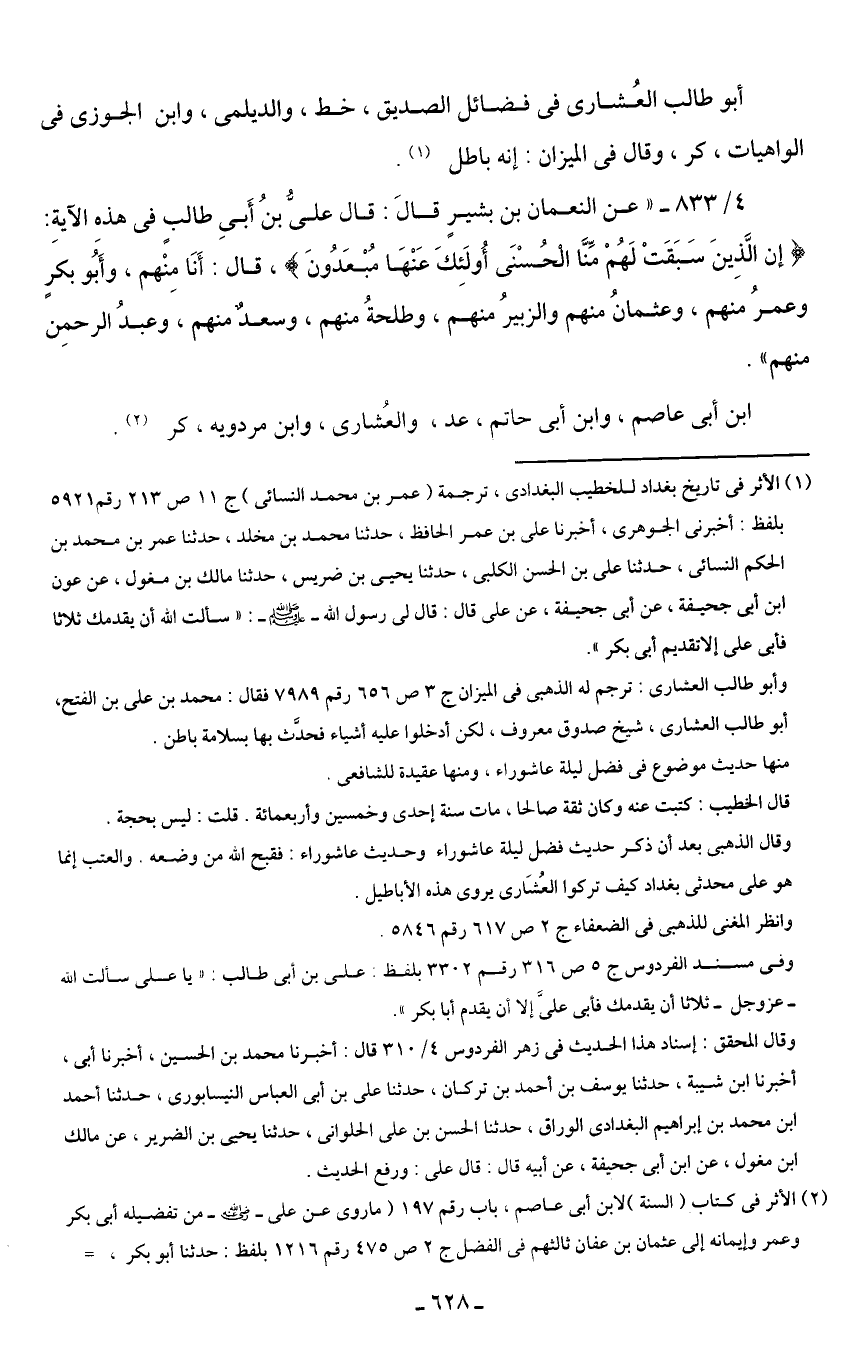 (¬1) الأثر في تاريخ بغداد للخطيب البغدادى، ترجمة (عمر بن محمد النسائى) ج 11 ص 213 رقم 5921 بلفظ: أخبرنى الجوهرى، أخبرنا على بن عمر الحافظ، حدثنا محمد بن مخلد، حدثنا عمر بن محمد بن الحكم النسائى، حدثنا على بن الحسن الكلبى، حدثنا يحيى بن ضريس، حدثنا مالك بن مغول، عن عون ابن أبي جحيفة، عن أبى جحيفة، عن علي قال: قال لى رسول الله - صلى الله عليه وسلم -: "سألت الله أن يقدمك ثلاثا فأبى على إلا تقديم أبي بكر".