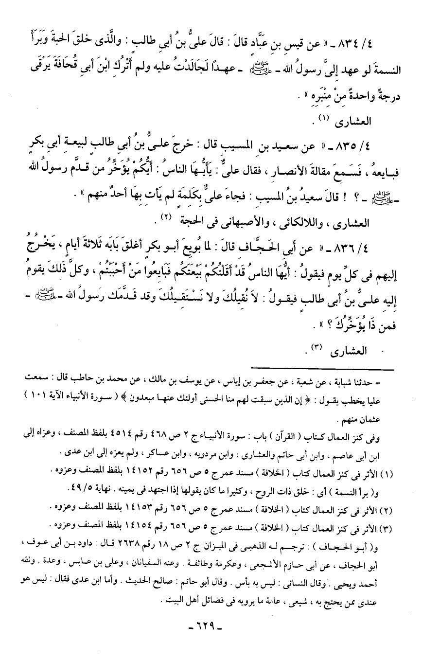 4/ 834 - "عن قيسِ بنِ عَبَّادٍ قالَ: قالَ علىُّ بنُ أبي طالب: والَّذى خلقَ الحبةَ وَبَرَأَ النسمةَ لو عهد إِلى رسولُ الله - صلى الله عليه وسلم - عهدًا لَجَالَدْتُ عليه ولمً أَتْرُكِ ابْنَ أبي قُحَافَةَ يَرْقَى درجةً واحدةً مِنْ مِنْبَرِهِ".