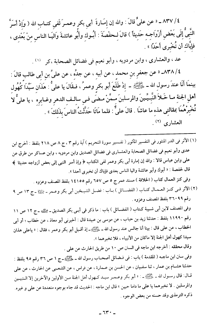 838/ 4 - "عن جعفرِ بنِ محمد، عن أبيهِ، عن جدِّهِ، عن عليِّ بنِ أبِى طالبٍ قالَ: بينمَا أَنَا عندَ رسولِ الله - صلى الله عليه وسلم - إِذْ طَلَعَ أَبو بكر وعمرُ، فقَالَ يا علىُّ هَذَانِ سيِّدَا كُهُولِ أهلِ الجنةِ ما خَلاَ النَّبِيِّينَ والمرسلينَ ممَّنْ مضَى في ساِلفِ الدهرِ وغابِرهِ، يا عليُّ لا تُخْبِرْهُمَا بمقالتِى هذهِ ما عاشَا. قالَ علىٌّ: فلما مَاتَا حَدَّثْتُ الناسَ بذَلكَ".