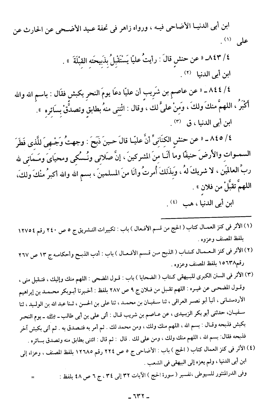 4/ 845 - "عن حنشٍ الكِنَانِيِّ أنَّ عليّا قالَ حينَ ذَبَحَ: وجهتُ وَجْهِىَ للَّذِى فَطَرَ السمواتِ والأرضَ حنيفًا وما أَنَا مِنَ المشركينَ، إنَّ صَلاتِى ونُسُكِى ومحيَاىَ ومَمَاتِى لله ربِّ العالميَن، لا شريكَ لهُ، وَبِذَلكَ أُمرتُ وأنَا منَ المسلمينَ، بسم الله والله أكبرُ منْكَ ولكَ، اللهمَّ تقبَّلْ من فلانٍ ".
