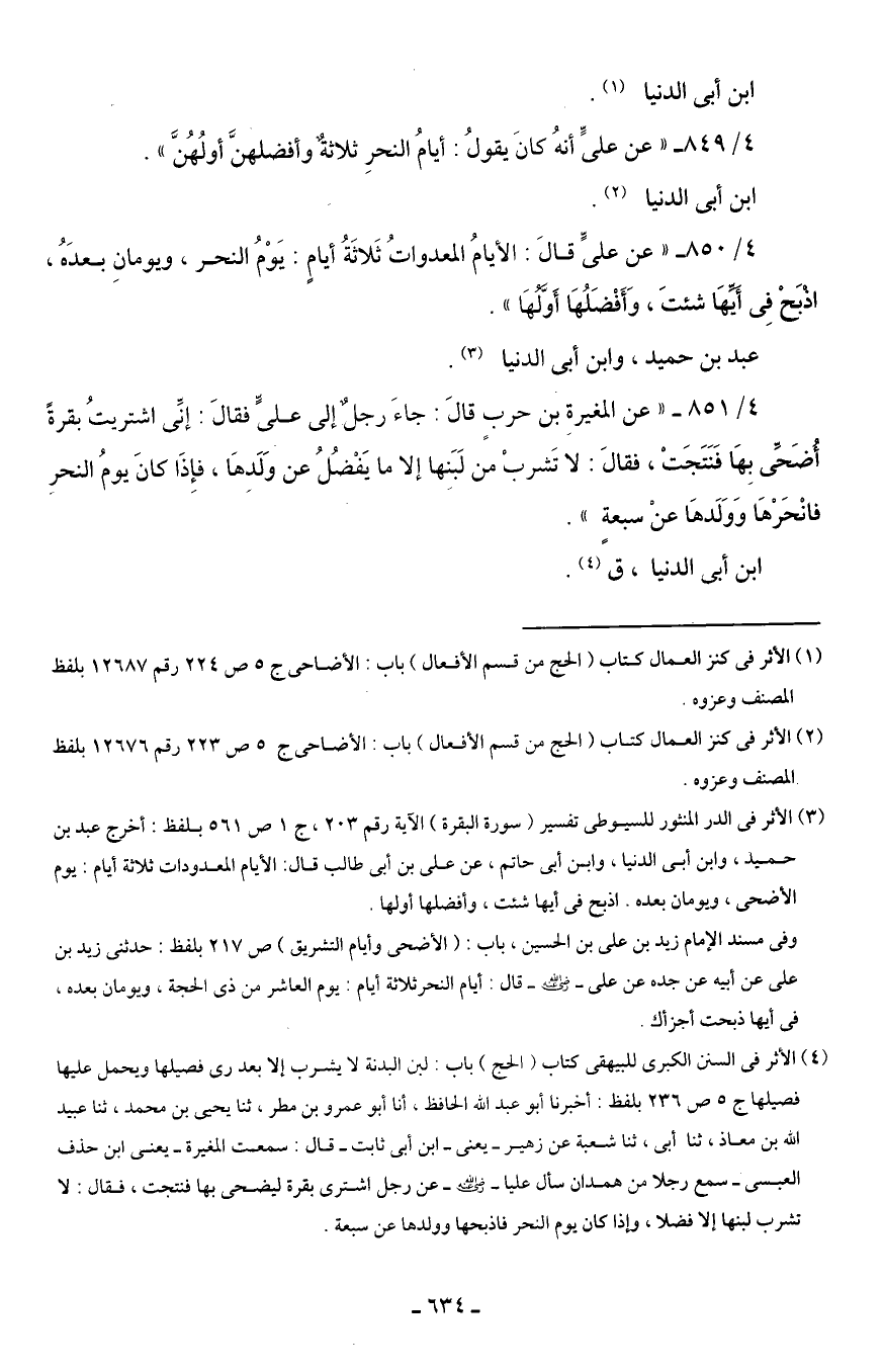 (¬3) الأثر في الدر المنثور للسيوطى تفسير (سورة البقرة) الآية رقم 203، ج 1 ص 561 بلفظ: أخرج عبد بن حميد، وابن أبى الدنيا، وابن أبى حاتم، عن علي بن أبى طالب قال: الأيام المعدودات ثلاثة أيام: يوم الأضحى، ويومان بعده. اذبح في أيها شئت، وأفضلها أولها.