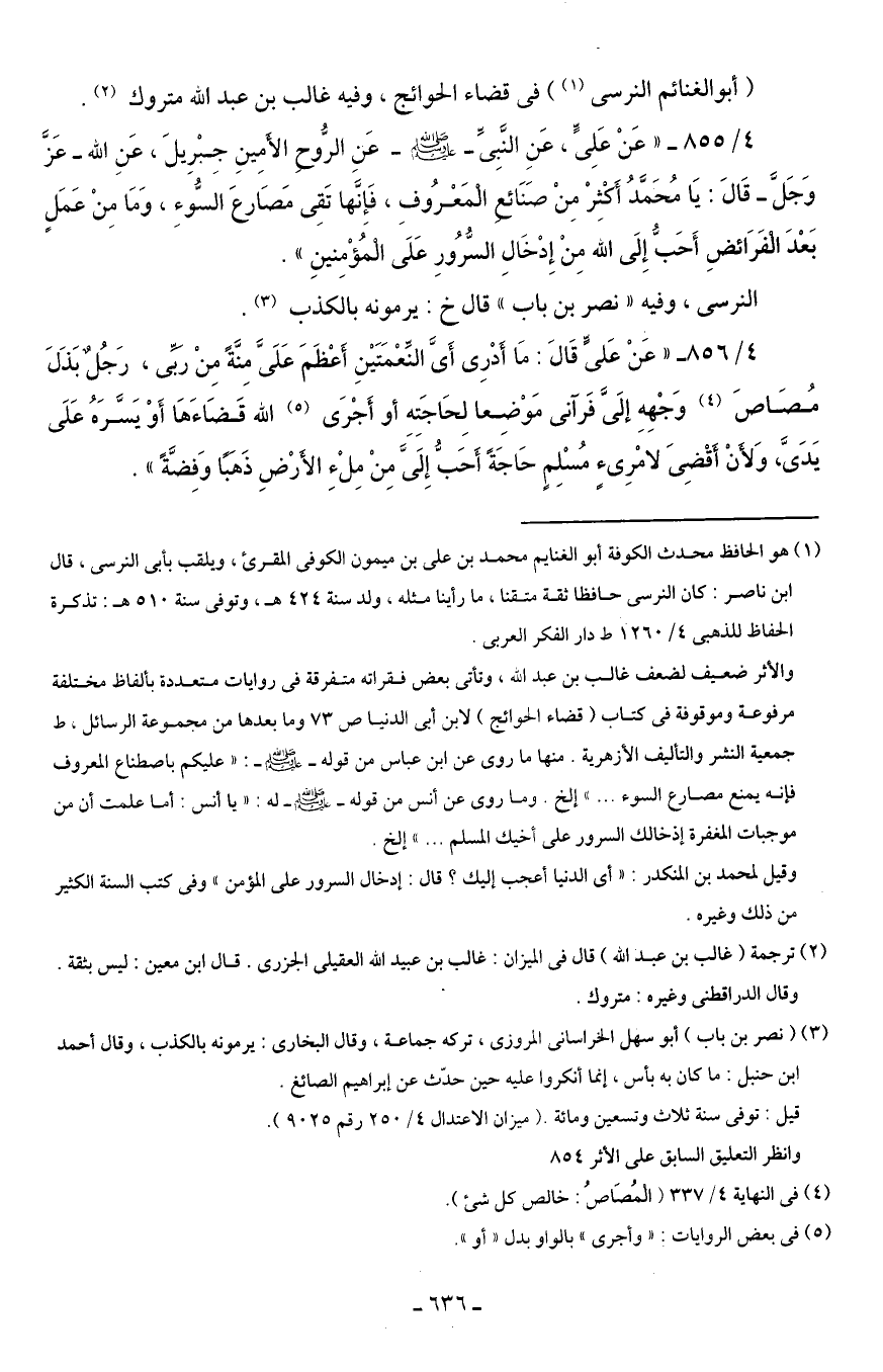 (أبو الغنائم النرسى) (¬1) في قضاء الحوائج، وفيه غالب بن عبد الله متروك (¬2).