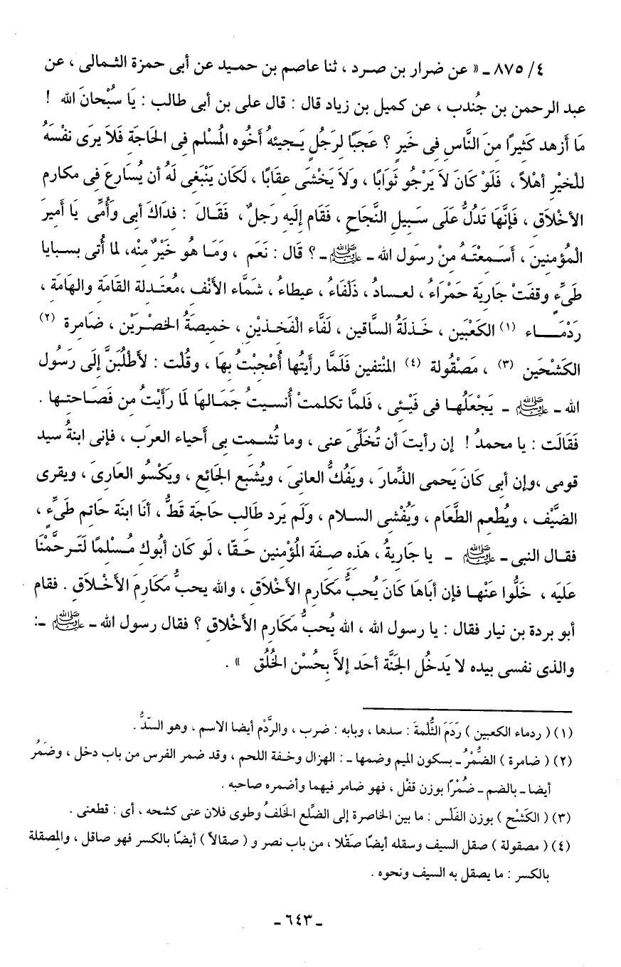 4/ 875 - "عن ضرار بن صرد، ثنا عاصم بن حميد عن أبى حمزة الثمالى، عن عبد الرحمن بن جُندب، عن كميل بن زياد قال: قال على بن أبى طالب: يَا سُبْحانَ الله! مَا أَزهد كَثِيرًا مِنَ النَّاسِ في خَيرٍ؟ عَجَبًا لِرَجُلٍ يَجيئهُ أَخُوه المُسْلم في الحَاجَةِ فَلاَ يرَى نفْسَهُ للخيْرِ أهْلًا، فَلَوْ كَانَ لاَ يَرْجُو ثَوَابا، وَلاَ يَخْشَى عِقَابًا، لَكَان يَنْبَغِى لَهُ أن يُسَارعَ في مكارم الأخْلاَقِ، فَإنَّهَا تَدُلُّ عَلَى سَبِيلِ النَّجَاح، فَقَام إِلَيهِ رَجلٌ، فَقَالَ: فِدَاكَ أبِى وَأُمِّى يَا أَمِيرَ الْمُؤمنِينَ، أَسَمِعْتَهُ مِنْ رسَول الله - صلى الله عليه وسلم -؟ قَال: نَعَم، وَمَا هُو خَيْرٌ مِنْه، لما أُتى بسبايا طَيِّء وقفَتْ جَارِيَة حَمْرَاءُ، لعسادُ، ذَلْفَاءُ، عيطاءُ، شَمَّاء الأَنْفِ، مُعتَدِلة القَامَةِ والهَامَةِ، رَدْمَاء (¬1) الكَعْبَين، خَذلَةُ السَّاقين، لَفَّاء الْفَخذيْنِ، خمِيصَةُ الخصْرَيْن، ضَامِرة (¬2) الكَشْحَين (¬3)، مَصْقُولة (¬4) المنْتفين فَلَمَّا رأَيتُها أُعجِبْتُ بِهَا، وقُلت: لأطلُبَنَّ إِلَى رَسُول الله - صلى الله عليه وسلم - يَجْعَلُها في فَيْئِى، فَلمَّا تكلمتْ أُنسيتُ جَمَالهَا لمَا رَأَيْتُ مِن فَصَاحتِها. فَقَالَت: يا محمدُ! إن رأيتَ أن تُخَلِّىَ عنى، وما تُشمِت بِى أَحياء العرَب، فإنى ابنةُ سيد قومى، وإن أبِى كَانَ يَحمى الذِّمارَ، ويَفُكُّ العانِىَ، ويُشَبع الجَائِع، ويَكْسُو العَارِىَ، ويقرى الضَّيْف، ويُطعِم الطَّعَام، وَيُفْشِى السلام، وَلَم يَرد طَالِب حَاجَة قَطُّ، أنَا ابنَة حَاتِم طَىِّءٍ، فقال النبي - صلى الله عليه وسلم - يا جَارِيةُ، هَذِه صِفَة المُؤْمِنين حَقّا، لَو كَانَ أبُوكِ مُسْلِمًا لَتَرحَّمْنَا عَليَه، خَلُّوا عَنْها فإن أبَاهَا كَانَ يُحبُّ مَكَارِم الأخْلاَقِ، والله يحبُّ مَكَارِمَ الأخْلاَقِ. فقام أبو بردة بن نيار فقال: يا رسول الله، الله يُحبُّ مَكَارِم الأخْلاقِ؟ فقال رسول الله - صلى الله عليه وسلم -: والذى نفسى بيده لا يَدخُل الجَنَّة أحَد إلَّا بِحُسْن الخُلُق".