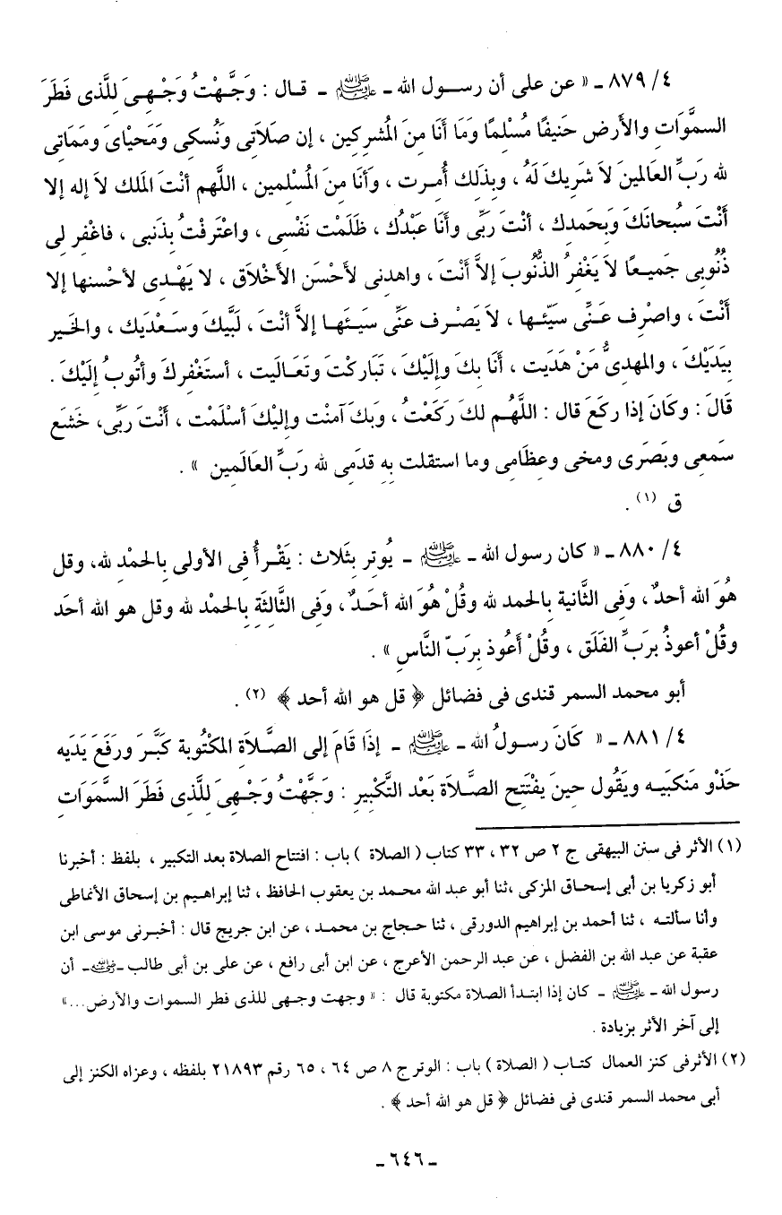 4/ 879 - "عن على أن رسول الله - صلى الله عليه وسلم - قال: وَجَّهْتُ وَجْهِىَ لِلَّذى فَطَرَ السمَّوَاتِ والأَرض حَنيفًا مُسْلِمًا وَمَا أَنَا مِنَ المُشرِكِين، إن صَلاَتِى وَنُسكِى وَمَحيْاىَ ومَمَاتِى للهِ رَبِّ العَالمينَ لاَ شَرِيكَ لَهُ، وبِذَلك أُمِرت، وَأنَا مِنَ المُسْلِمين، اللَّهم أنْتَ المَلك لاَ إله إلا أَنْتَ سُبحانَكَ وَبِحَمدِك، أنْتَ ربِّىَ وأَنَا عَبْدُك، ظَلَمْت نَفْسِى، واعْتَرفْتُ بِذَنبى، فاغْفِر لِى ذُنُوبِى جَميعًا لاَ يَغْفِرُ الذُّنُوبَ إلاَّ أَنْتَ، واهدِنى لأَحْسَن الأَخْلاَق، لا يَهْدِى لأحْسنها إلا أَنْتَ، واصْرِف عَنِّى سَيّئها، لاَ يَصْرف عَنِّى سَيئَها إلاَّ أنْتَ، لَبَّيكَ وسَعْدَيك، والخَير بِيَدَيْكَ، والمهدِىُّ مَنْ هَدَيت، أَنَا بِكَ وإِلَيْكَ، تَبَاركْتَ وتَعَالَيت، أستَغْفِركَ وأتُوبُ إِلَيْكَ. قَالَ: وكَانَ إذا ركَعَ قال: اللَّهُم لكَ رَكَعْتُ، وَبكَ آمنْت وِإليْكَ أسْلَمْت، أَنْتَ ربِّى، خَشَع سَمعِى وبَصَرى ومخى وعظَامِى وما استقلت به قدَمِى لله رَبِّ العَالمَين".
