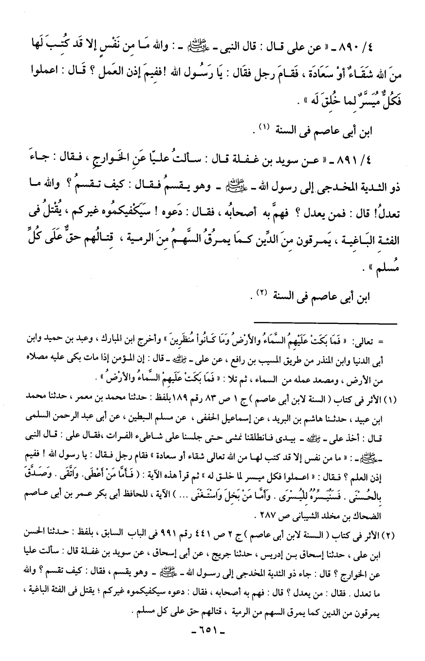 (¬1) الأثر في كتاب (السنة لابن أبى عاصم) ج 1 ص 83 رقم 89 ابلفظ: حدثنا محمد بن معمر، حدثنا محمد ابن عبيد، حدثنا هاشم بن البريد، عن إسماعيل الحففى، عن مسلم البطين، عن أبى عبد الرحمن السلمى قال: أخذ على - كت - بيدى فانطلقنا نمشى حتى جلسنا على شاطئ الفرات، فقال على: قال النبي - صلى الله عليه وسلم -: " ما من نفس إلا قد كتب لها من الله تعالى شقاء أو سعادة، فقام رجل فقال: يا رسول الله! ففيم إذن العلم؟ فقال: " اعملوا فكل ميسر لما خلق له! ثم قرأ هذه الآية: {فَأَمَّا مَنْ أَعْطَى وَاتَّقَى (5) وَصَدَّقَ بِالْحُسْنَى (6) فَسَنُيَسِّرُهُ لِلْيُسْرَى (7) وَأَمَّا مَنْ بَخِلَ وَاسْتَغْنَى} ... } الآية، للحافظ أبى بكر عمر بن أبى عاصم الضحاك بن مخلد الشيبانى ص 287.