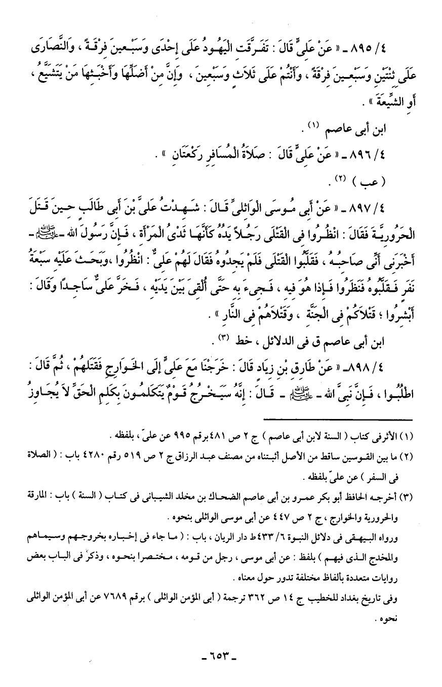 4/ 897 - " عَنْ أَبِى مُوسَى الْوَاثِلىِّ قَالَ: شَهِدْتُ عَلىَّ بْنَ أَبِى طَالَبٍ حِينَ قَتَلَ الْحَرُورِيَّةَ فَقَالَ: انْظُرُوا فِى الْقَتْلَى رَجُلًا يَدُهُ كَأَنَّهَا ثَدْىُ الْمَرأَةِ، فَإِنَّ رَسُولَ الله - صلى الله عليه وسلم - أَخْبَرَنِى أَنِّى صَاحِبُهُ، فَقَلَّبُوا الْقَتْلَى فَلَمْ يَجِدُوهُ فَقَالَ لَهُمْ عَلِىٌّ: انْظُرُوا، وَبَحَثَ عَلَيْهِ سَبْعَةُ نَفَرٍ فَقَلَّبُوهُ فَنَظَرُوا فَإذا هُوَ فِيهِ، فَجِئَ بِه حَتَّى أُلْقِىَ بَيْنَ يَدَيْهِ، فَخَرَّ عَلىٌّ سَاجِدًا وَقَالَ: أَبْشِرُوا، قَتْلاَكُمْ فِى الْجَنَّةِ، وَقَتْلاَهُمْ فِى النَّارِ ".