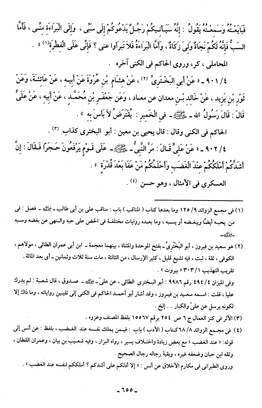 4/ 902 - " عَنْ عَلِىٍّ قَالَ: مَرَّ النَّبِىُّ - صلى الله عليه وسلم - عَلَى قَوْمٍ يَرْفَعُونَ حَجَرًا فَقَالَ: إِنَّ أَشَدَّكُمْ أمْلَكُكُمْ عِنْدَ الْغَضَبِ وَأَحْلَمُكُمْ مَنْ عَفَا بَعْدَ قُدْرَةٍ ".