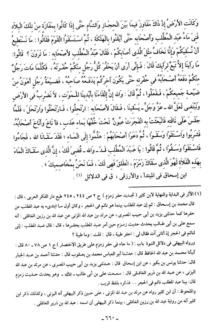 (¬1) الأثر في البداية والنهاية لابن كثير (تجديد حفر زمزم) ج 2 ص 244، 245 طبع دار الفكر العربى، قال: قال محمد بن إسحاق: ثم إن عبد المطلب بينما هو نائم في الحجر، وكان أول ما ابتدئ به عبد المطلب من حفرها كما حدثنى يزيد بن أبى حبيب المصرى، عن مرثد بن عبد الله المزنى عن عبد الله بن رزين الغافقى: أنه سمع على بن أبى طالب يحدث حديث زمزم حين أمر عبد المطلب بحفرها، قال: قال عبد المطلب: إنى لنائم في الحجر إذ أتانى آت فقال لى: احفر طيبة، قال: قلت: وما طيبة؟ ورواه البيهقى في دلائل النبوة باب: (ما جاء في حفر زمزم على طريق الاختصار) ج 1 ص 78 - 80 قال: أنبائا محمد بن عبد الله الحافظ قال: حدثنا أبو العباس محمد بن يعقوب قال: حدثنا أحمد بن عبد الجبار قال: حدثنا يونس بن بكير، عن ابن إسحاق قال: حدثنى بزيد بن أبى حبيب المصرى، عن مرثد بن عبد الله اليزنى، عن عبد الله بن ذرير الغافقى قال: سمت على بن أبى طالب - رضي الله عنه - وهو يحدث حديث زمزم قال: بينا عبد المطلب نائم في الحجر ... فذكره بلفظ قريب.
