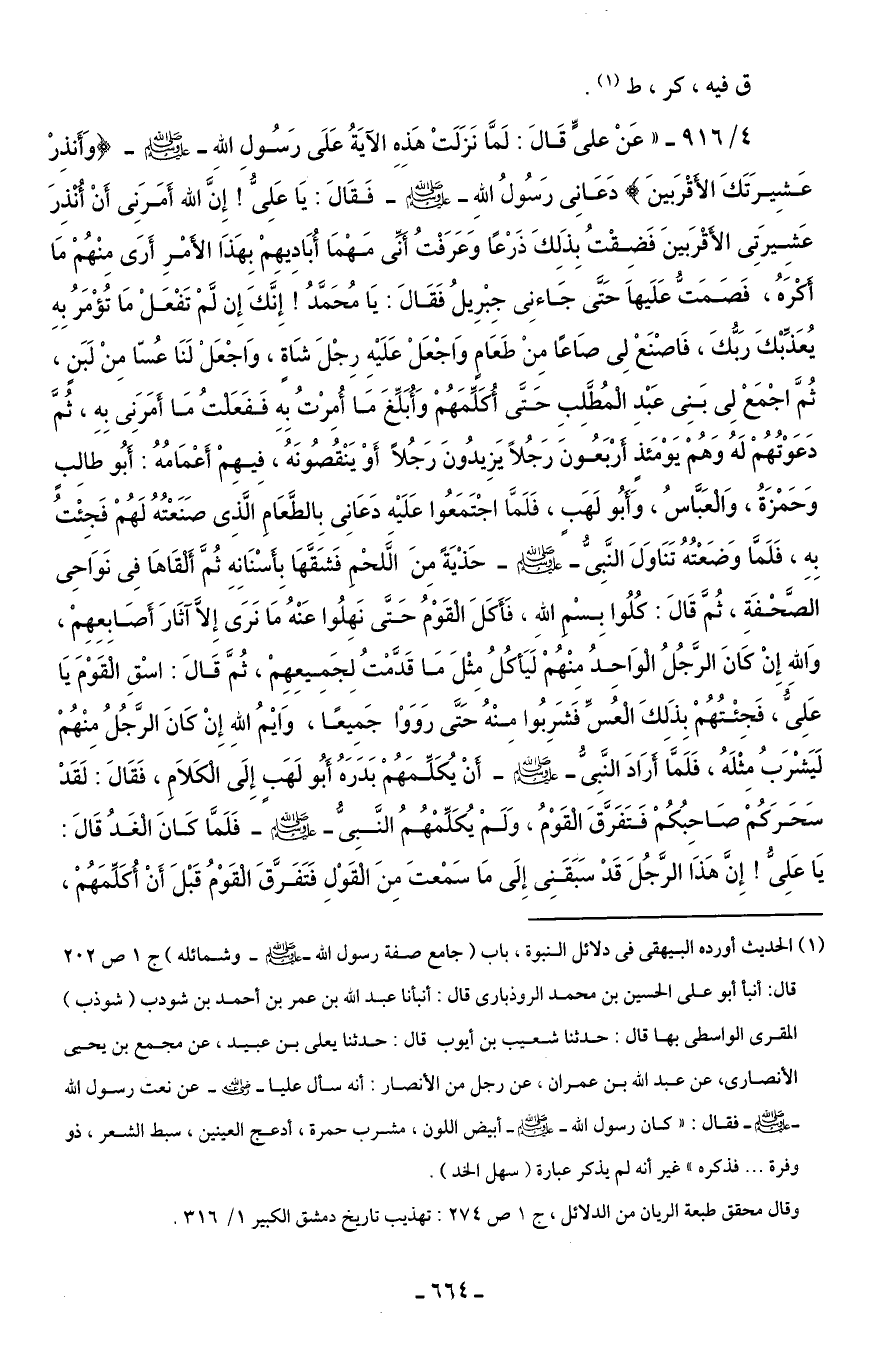 4/ 916 - " عَنْ عليٍّ قَالَ: لَمَّا نَزَلَتْ هَذِهِ الآيَةُ عَلَى رَسُولِ اللهِ - صلى الله عليه وسلم - {وَأَنذِرْ عَشِيرَتَكَ الأقْرَبينَ} دَعَانِى رَسُولُ اللهِ - صلى الله عليه وسلم - فَقَالَ: يَا عَلِىُّ إِنَّ الله أَمَرَنِى أَنْ أنذِرَ عَشيرَتِى الأَقْرَبينَ فَضِقْتُ بِذَلِكَ ذَرْعًا وَعَرَفْتُ أَنِّى مَهْمَا أُبَادِيهِمْ بِهَذَا الأمْرِ أَرَى مِنْهُمْ مَا أَكْرَهُ، فَصَمَتُّ عَلَيهاَ حَتَّى جَاءنِى جِبْرِيلُ فَقَالَ: يَا مُحَمَّدُ! إِنَّكَ إِنَّ لَمْ تَفْعَلْ مَا تُؤْمَرُ بِهِ يُعَذِّبْكَ رَبُّكَ، فَاصْنَعْ لِى صَاعًا مِنْ طَعَامٍ وَاجْعَلْ عَلَيْهِ رِجْلَ شَاةٍ، وَاجْعَلْ لَنَا عُسّا مِنْ لَبَنٍ، ثُمَّ اجْمَعْ لِى بَنِى عَبْدِ الْمُطلِبِ حَتَّى أُكَلِّمَهمْ وَأُبَلَغِّ مَا أُمِرْتُ بِهِ فَفَعَلْتُ مَا أمَرَنِى بِهِ، ثُمَّ دَعَوْتُهُمْ لَهُ وَهُمْ يَوْمَئذٍ أَرْبَعُونَ رَجُلًا يَزِيدُونَ رَجُلًا أَوْ يَنْقُصُونَهُ، فِيهِمْ أَعْمَامُهُ: أَبُو طالِبٍ وَحَمْزَةُ، وَالْعَبَّاسُ، وَأَبُو لَهَبٍ، فَلَمَّا اجْتَمَعُوا عَلَيْه دَعَانِى بِالطَّعَامِ الَّذِى صَنَعْتُهُ لَهُمْ فَجِئْتُ بِهِ، فَلَمَّا وَضَعْتُهُ تَنَاوَلَ النَّبِى - صلى الله عليه وسلم - حَذْيَةً مِنَ اللحْمِ فَشَقَّهَا بِأَسْنَانِهِ ثُمَّ أَلْقَاهَا فِى نَوَاحِى الصَّحْفَةِ، ثُمَّ قَالَ: كُلُوا بِسْم اللهِ، فَأَكَلَ الْقَوْمُ حَتَّى نَهِلُوا عَنْهُ مَا نَرَى إِلاَّ آثَارَ أَصَابعِهِمْ، وَالله إِنْ كَانَ الرَّجُلُ الْوَاحِدُ مِنْهُمْ لَيَأكُلُ مِثْلَ مَا قَدَّمْتُ لِجَمِيعِهِمْ، ثُمَّ قَالَ: اسْقِ الْقَوْمَ يَا عَلِىُّ، فَجِئْتُهُمْ بِذَلِكَ الْعُسِّ فَشَرِبُوا مِنْهُ حَتَّى رَوَوْا جَمِيعًا، وَايْمُ اللهِ إِنْ كَانَ الرَّجُلُ مِنْهُمْ لَيَشْرَبُ مِثْلَهُ، فَلَمَّا أرَادَ النَّبِى - صلى الله عليه وسلم - أَنْ يُكَلِّمَهُمْ بَدَرَهُ أَبُو لَهَبٍ إِلَى الْكَلاَمِ، فَقَالَ: لَقَدْ سَحَرَكُمْ صَاحِبُكُمْ فَتَفَرق الْقَوْمُ، وَلَمْ يُكَلِّمْهُمُ النَّبِىُّ - صلى الله عليه وسلم - فَلَمَّا كانَ الْغَدُ قَالَ: يَا عَلِىُّ إِنَّ هَذَا الرَّجُلَ قَدْ سَبَقَنِى إِلَى مَا سَمْعتَ مِنَ الْقَوْلِ فَتَفَرَّقَ الْقَوْمُ قَبْلَ أَنْ أُكلِّمَهُمْ،