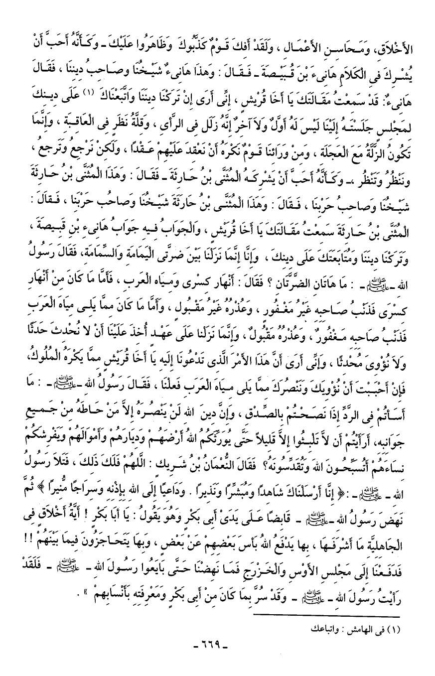 الأَخْلاَقِ، وَمَحَاسِنِ الأَعْمَالِ، وَلَقَدْ أَفِكَ قَوْمٌ كَذَّبُوكَ وَظَاهَرُوا عَلَيْكَ - وَكَأَنَّهُ أَحَبَّ أَنْ يُشْرِكَ في الْكَلاَمِ هَانِئَ بْنَ قُبَيْصَةَ - فَقَالَ: وَهذَا هَانِئٌ شَيْخُنَا وصَاحِبُ دِينِنَا، فَقَالَ هَانِئٌ: قَدْ سَمِعْتُ مَقَالَتَكَ يَا أَخَا قُرْيشٍ، إِنِّى أَرَى إِنْ تَرَكْنَا دِينَنَا وَاتّبَعْنَاكَ (¬1) عَلَى دِينكَ لِمَجْلِسٍ جَلَسْتَهُ إِلَيْنَا لَيْسَ لَهُ أَوَّلٌ وَلاَ آخِرٌ إِئهُ زَلَل فِى الرَّأي، وَقِلَّةُ نَظَرٍ فِى الْعَاقِبَةِ، وَإَنَّمَا تَكُونُ الزَّلَّةُ مَعَ الْعَجَلَة، وَمِنْ وَرَائِنَا قَوْمٌ نَكْرَهُ أَنْ نَعْقِدَ عَلَيْهِمْ عَقْدًا، وَلَكِنْ نَرْجِعُ وَتَرجعُ، ونَنْظُرُ وَتَنْظُر، وَكَأنَّهُ أحَبَّ أَنْ يَشْرِكَهُ الْمُثَنَّى بْنُ حَارِثَةَ - فَقَالَ: وَهَذَا الْمُثَنَّى بْنُ حَارِثَةَ شَيْخُنَا وَصاحِبُ حَرْبِنَا، فَقَالَ: وَهَذَا الْمُثَنَّى بْنُ حَارَثَةَ شَيْخُنَا وَصاحُب حَرْبَنِا، فَقاَلَ: الْمُثَنَّى بْنُ حَارِثَةَ سَمِعْتُ مَقَالَتَكَ يَا أَخَا قُرَيْشٍ، وَالْجَوَابُ فِيه جَوَابُ هَانِئِ بْنِ قَبِيصَةَ، وَتَرَكْنَا دينَنَا وَمُتَابَعَتَكَ عَلَى دينِكَ، وَإِنَّا إِنَّمَا نَزَلْنَا بَيْنَ ضرَتى الْيَمَامَةِ وَالسِّمَامَةِ، فَقَالَ رَسُولُ اللهِ - صلى الله عليه وسلم -: مَا هَاتَانِ الضَّرتَانِ؟ فَقَالَ: أَنْهَار كِسْرى وَمِيَاه الْعَربِ، فَأَمَّا مَا كانَ مِنْ أَنْهَارِ كِسْرَى فَذَنْبُ صَاحِبِه نجَيْرُ مَغْفُورٍ، وَعُذْرُهُ غَيْرُ مَقْبُول، وَأَفَا مَا كانَ مِمَّا يَلِى مِيَاهَ الْعَرَب فَذَنْبُ صَاحِبِهِ مَغْفُورٌ، وَعُذْرُهُ مَقْبُولٌ، وَإِنَّمَا نَزَلْنا عَلَى عَهْدٍ أُخِذَ عَلَيْنَا أَنْ لا نُحْدِثَ حَدَثًا وَلاَ نُؤْوِىَ مُحْدِثًا، وَإنِّي أَرَى أَنَّ هَذَا الأمْرَ الَّذِى تَدْعُونَا إِلَيه يَا أَخَا قُرَيْشٍ مِمَّا يَكْرَهُ الْمُلُوكُ، فَإِنْ أَحْبَبْتَ أَنْ نُؤْوِيَكَ وَنَنْصُرَكَ ممَّا يَلى مِيَاهَ الْعَرَبِ فَعلنَاَ، فَقَالَ رَسُولُ اللهِ - صلى الله عليه وسلم -: مَا أَسَأتُمْ فِى الرَّدَّ إِذَا نَصَحْتُمْ بِالصِّدْقِ، وَإِنَّ دينَ اللهِ لَن يَنْصُرَهُ إِلاَّ مَنْ حَاطَهُ مِنْ جَميعِ جَوَانِبِهِ، أَرَأَيْتُمْ أَن لاَّ تَلبِثُوا إِلاَّ قَلِيلًا حَتَّى يُوَرَثكُمُ الله أَرْضَهُمْ وَدِيَارَهُمْ وَأَمْوَالَهُمْ وَيَفْرِشَكُمْ نِسَاءَهُمْ أَتُسبِّحُونَ اللهَ وَتُقَدِّسُونَهُ؟ فَقَالَ النُّعْمَانُ بْنُ شَرِيكٍ: الَّلهُمْ فَلَكَ ذَلِكَ، فَتَلاَ رَسُولُ اللهِ - صلى الله عليه وسلم -: {إِنَّا أَرْسَلْنَاكَ شَاهِدًا وَمُبَشِّرًا وَنَذِيرًا.