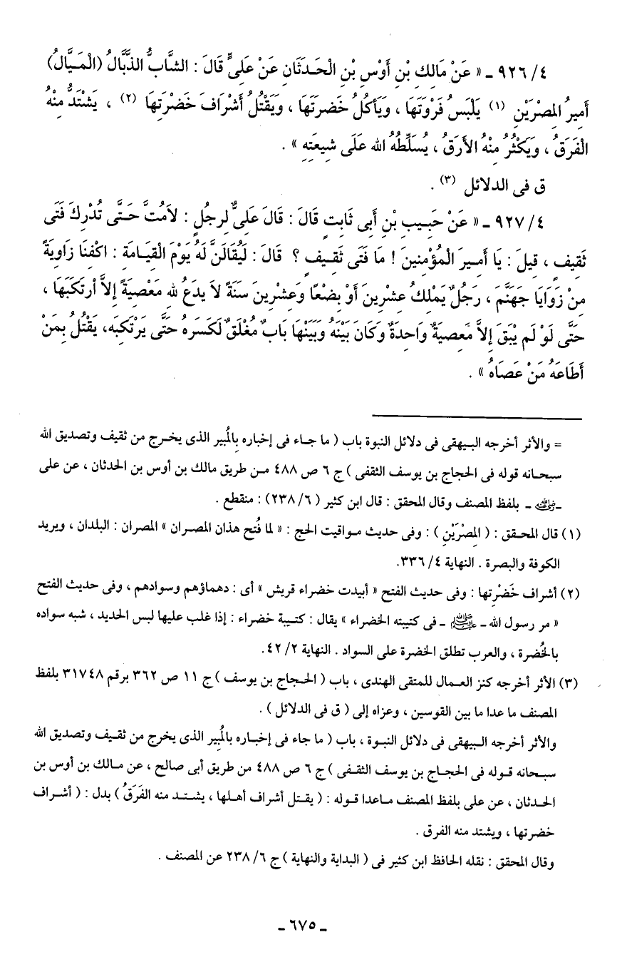 4/ 926 - " عَنْ مَالِكِ بْنِ أَوْسِ بْنِ الْحَدَثَانِ عَنْ عَلِىٍّ قَالَ: الشَّابُّ الذَّبَّالُ (الْمَيَّالُ) أَميرُ المِصْرَيْنِ (¬1) يَلبَسُ فَرْوَتَهَا، وَيَأكُلُ خَضرَتَهَا، وَيَقْتُلُ أَشْرَافَ خَضْرَتِهَا (¬2)، يَشْتَدُّ مِنْهُ الْفَرَقُ، وَيَكْثُرُ مِنْهُ الأَرَقُ، يُسَلِّطُهُ الله عَلَى شِيعَتِهِ ".