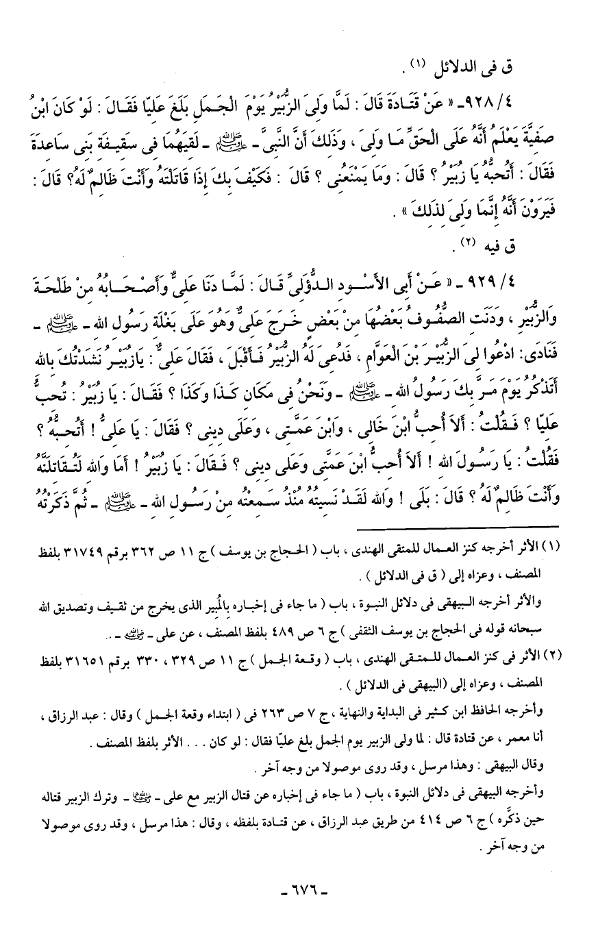 4/ 928 - " عَنْ قَتَادَةَ قَالَ: لَمَّا وَلِىَ الزُّبَيْرُ يَوْمَ الْجَمَلِ بَلَغَ عَلِيّا فَقَالَ: لَوْ كَانَ ابْنُ صَفِيَّةَ يَعْلَمُ أَنَّهُ عَلَى الْحَقِّ مَا وَلِىَ، وَذَلِكَ أَن النَّبِىَّ - صلى الله عليه وسلم - لَقِيَهُمَا فِى سَقِيفَةِ بَنِى سَاعِدَةَ فَقَالَ: أَتُحبُّهُ يَا زُبَيْرُ؟ قَالَ: وَمَا يَمْنَعُنِى؟ قَالَ: فَكَيْفَ بِكَ إِذا قَاتَلتَهُ وَأَنْتَ ظَالِمٌ لَهُ؟ قَالَ: فَيَرَوْنَ أَنَّهُ إِنَّمَا وَلِىَ لِذَلِكَ ".