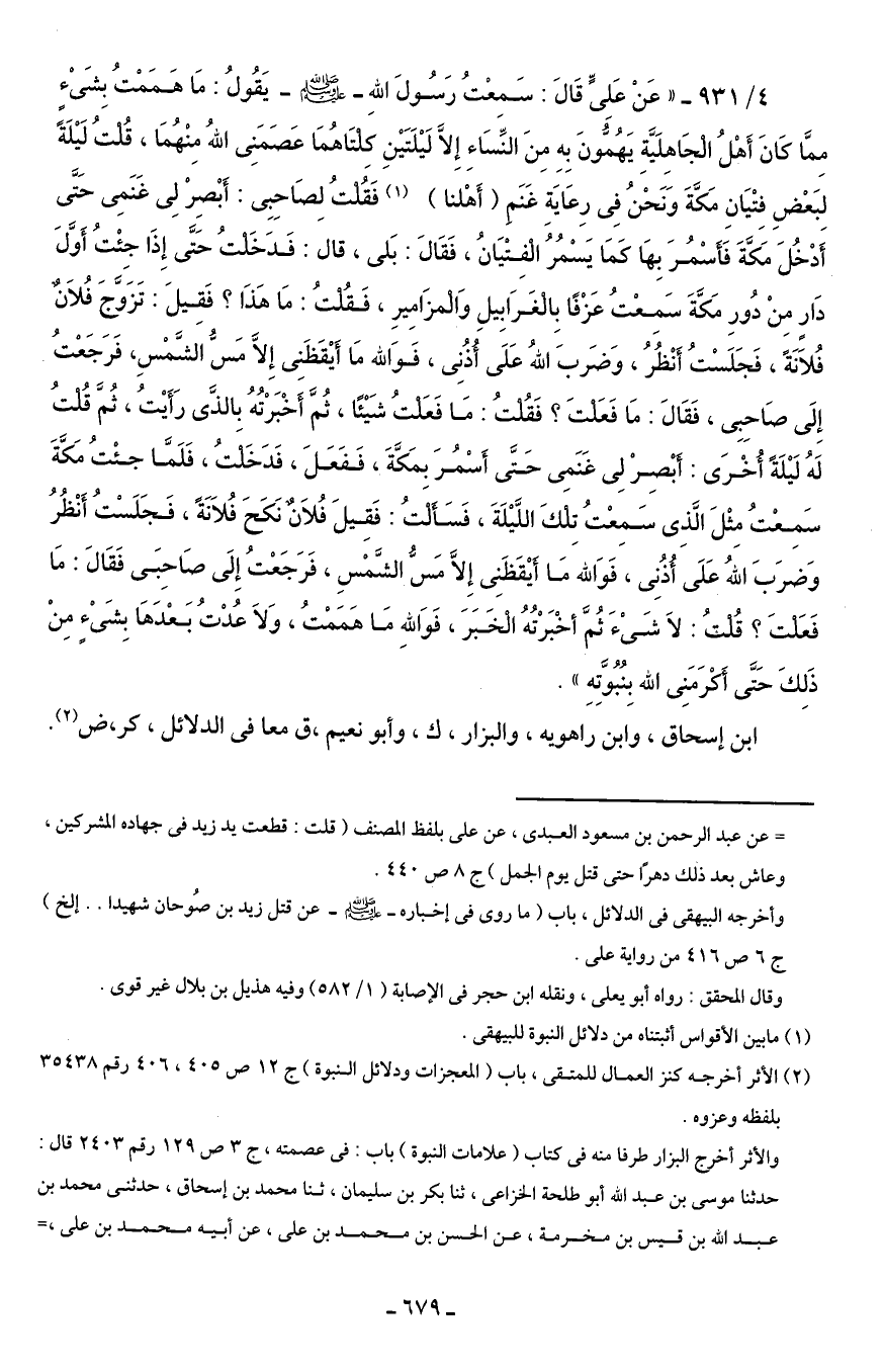 4/ 931 - " عَنْ عَلِىٍّ قَالَ: سَمعْتُ رَسُولَ الله - صلى الله عليه وسلم - يَقُولُ: مَا هَمَمْتُ بشَىْءٍ مِمَّا كَانَ أَهْلُ الْجَاهِلَيَّةِ يَهُمُونَ بِهِ مِنَ النِّسَاءِ إِلاَّ لَيْلَتَيْنِ كَلْتَاهُمَا عَصَمَنِى الله مِنْهُمَا، قُلتُ لَيْلَةً لِبَعْضِ فِتْيَانِ مَكَّةَ وَنَحْنُ فِى رِعَايَةِ غَنَم (أَهْلنا) (¬1) فَقُلْتُ لِصَاحِبِى: أَبْصِرْ لِى غَنَمِى حَتَّى أَدْخُلَ مَكَّةَ فَأَسْمُرَ بِهَا كَمَا يَسْمُرُ الْفتْيَانُ، فَقَالَ: بَلى، قال: فَدَخَلتُ حَتَّى إِذَا جِئْتُ أَوَّلَ دَارٍ مِنْ دُورِ مَكَّةَ سَمِعْتُ عَزْفًا بِالْغَرَابِيلِ وَالْمزَامِيرِ، فَقُلتُ: مَا هَذَا؟ فَقِيلَ: تَزَوَّجَ فُلاَنٌ فُلاَنَةً، فَجَلَسْتُ أَنْظُرُ، وَضَربَ الله عَلَى أُذُنِى، فَوَالله مَا أَيْقَظَنِى إِلاَّ مَسٌّ الشَّمْسِ، فَرَجَعْتُ إِلَى صَاحِبِى، فَقَالَ: مَا فَعَلْتَ؟ فَقُلْتُ: مَا فَعَلْتُ شَيْئًا، ثُمَّ أَخْبَرْتُهُ بالذى رَأَيْتُ، ثُمَّ قُلتُ لَهُ لَيْلَةً أُخْرَى: أبْصِرْ لِى غَنَمِى حَتَّى أَسْمُرَ بمَكَّةَ، فَفَعَلَ، فَدَخَلْتُ، فَلَمَّا جئْتُ مَكَّةَ سَمِعْتُ مِثْلَ الَّذِى سَمِعْتُ تِلكَ اللَّيْلَةَ، فَسَأَلْتُ: فَقِيلَ فُلاَنٌ نَكَحَ فُلاَنَةً، فَجَلَسْتُ أَنْظُرُ وَضرَبَ الله عَلَى أُذُنِى، فَوَالله مَا أَيْقَظَنِى إِلاَّ مَسُّ الشَّمْسِ، فَرَجَعْتُ إِلَى صَاحِبَى فَقَالَ: مَا فَعَلْتَ؟ قُلت: لاَ شَىْءَ ثُمَّ أخْبَرْتُهُ الْخَبَرَ، فَوَاللهِ مَا هَمَمْتُ، وَلاَ عُدْتُ بَعْدَهَا بِشَىْءٍ مِنْ ذَلِكَ حَتَّى أَكرَمَنِى الله بِنُبُوَّتِهِ ".