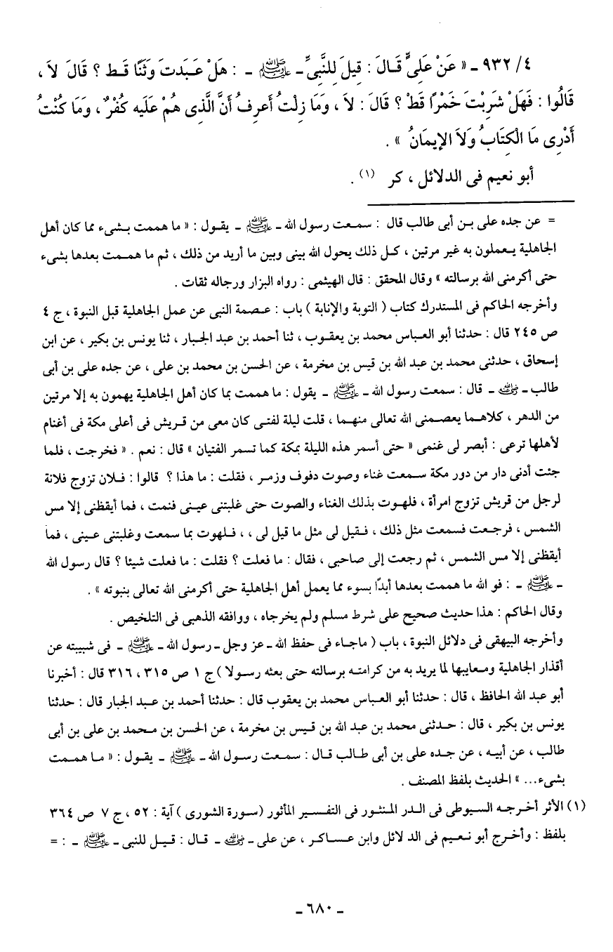 4/ 932 - "عَنْ عَلِىٍّ قَالَ: قِيلَ لِلنَّبِىِّ - صلى الله عليه وسلم -: هَلْ عَبَدتَ وَثنًا قَط؟ قَالَ لاَ، قَالُوا: فَهَلْ شَرِبْتَ خَمْرًا قَطْ؟ قَالَ: لاَ، وَمَا زِلْتُ أَعرِفُ أَنَّ الَّذِى هُمْ عَلَيه كُفْرٌ، وَمَا كُنْتُ أَدْرِى مَا الْكِتَابُ وَلاَ الإيمَانُ".