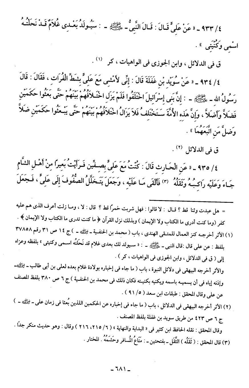 4/ 933 - "عَنْ عَلِىٍّ قَالَ: قَالَ النَّبِىُّ - صلى الله عليه وسلم -: سَيُولَدُ بَعْدِى غُلاَمٌ قَدْ نَحَلتُهُ اسْمِى وَكُنْيَتِى".