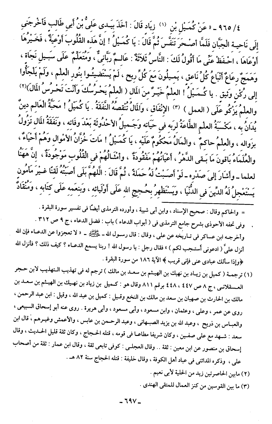 4/ 965 - "عَنْ كُمَيْلِ بْنِ (¬1) زِيَاد قَالَ: أخَذَ بِيَدِى عَلِىُّ بْنُ أَبي طَالِبٍ فَأخْرجَني إِلَى نَاحِيةِ الْجَبَّانِ فَلَمَّا أصْحَرَ تَنَفَّسَ ثُمَّ قَالَ: يَا كُمَيْلُ! إنَّ هَذِه القُلُوبَ أَوْعِيَةٌ، فَخَيْرُهَا أَوْعَاهَا، احْفَظْ عَنِّى مَا أَقُولُ لَكَ: النَّاسُ ثَلاَثَةٌ: عَالِم رَبَّانِىٌّ، وَمُتَعَلِّمٌ عَلَى سَبيلِ نَجَاةٍ، وَهَمَجٌ رِعَاع أَتْبَاعُ كُلِّ نَاعِقٍ، يَميلُونَ مَعَ كُلِّ رِيح، لَمْ يَسْتَضِيئُوا بِنُورِ الْعِلم، وَلَمْ يَلْجَأُوا إِلى رُكْنٍ وَثيقٍ. يا كُمَيْلُ! العَلمُ خَيْر مِنَ المَالِ (الْعِلمُ يَحْرُسُكَ وَأنْتَ تَحْرُسُ المَالَ) (¬2) والعِلمُ يَزْكُو عَلَى (العمل) (¬3) الإِنْفَاقِ، وَالمَالُ تُنْقِصُهُ النَّفَقَةُ. يَا كُمَيْلُ! مَحَبَّةُ الْعَالِم دِينٌ يُدَانُ بِه، مَكْسَبَةُ العلم الطَّاعَةُ لِرَبه في حَيَاتِه وَجَمِيلُ الأحْدُوثَةِ بَعْدَ وفَاتِه، وَنَفَقَةُ المَالِ تَزُولُ بزَواله، والْعِلمُ حاكِمٌ، والْمَالُ مًحكُومٌ عَلَيْهِ، يَا كُمَيْلُ! مَاتَ خُزَّانُ الَأمْوالِ وَهُمْ أَحْيَاءٌ، والْعُلَمَاءُ بَاقونَ مَا بَقى الدَّهْرُ، أَعْيَانُهُمْ مَفْقُودَةٌ، وأمْثَالُهُمْ في الْقُلُوبِ مَوْجُودَةٌ، إِنَّ هَاهَنُا لعلما - وأَشَارَ إلىَ صَدْرِه - لَوْ أَصَبْتُ لَهُ حَمَلةً، ثُمَّ قَالَ: الَّلهُمَ بَلَى أَصَبْتُهُ لَقِنًا غيْرَ مَأمُونٍ يَسْتَعْجِلُ لَهُ الدِّينَ في الدُّنْيَا، وَيَسْتَظهِرُ بِحُجِج اللهِ عَلَى أَوْلَيائِهِ، وَبنِعَمِهِ عَلَى كتَابهِ، وَمُنْقَادٌ