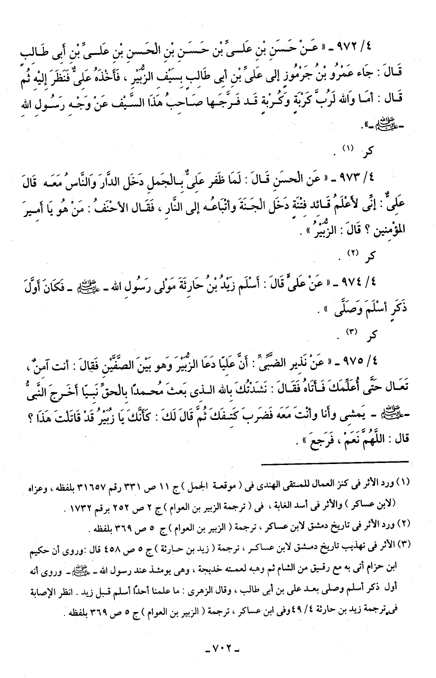 4/ 972 - "عَنْ حَسَنِ بْنِ عَلىِّ بْن حَسَنِ بْنِ الْحَسنِ بْنِ عَلىِّ بْنِ أَبِى طَالِب قَالَ: جَاء عَمْرُو بْنُ جَرْمُوز إلى عَلىِّ بْنِ أبِى طَالِبٍ بِسَيْفِ الزُّبَيْرِ، فَأَخْذَهُ عَلِىٌّ فَنَظَرَ إِليْهِ ثُم قَال: أمَا وَالله لَرُبَّ كَرْبَةٍ وَكُرْبةٍ قَد فَرَّجَها صَاحبُ هَذَا السَّيْف عَنْ وَجْه رَسُولِ اللهِ - صلى الله عليه وسلم - ".