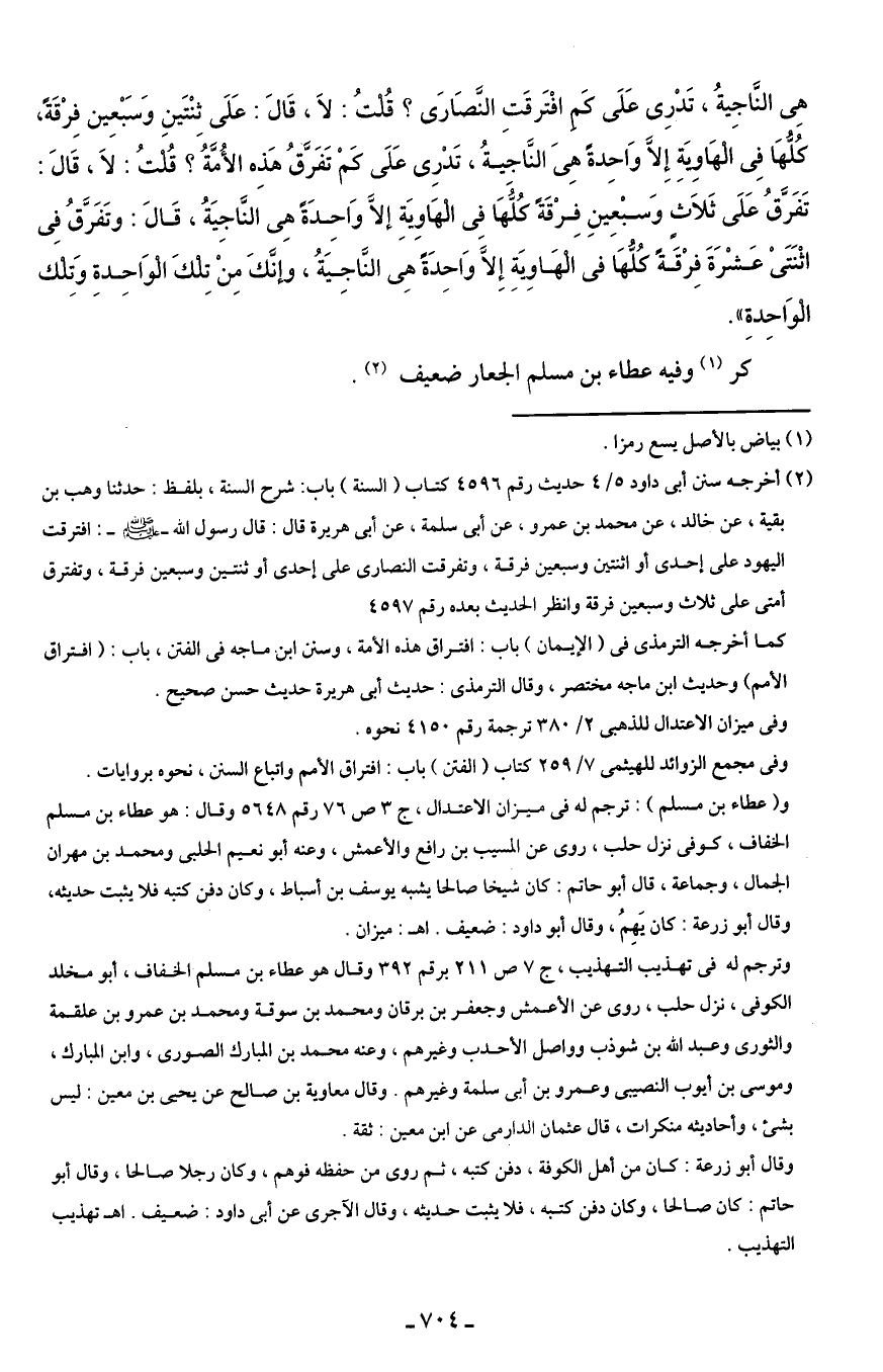 (¬2) أخرجه سنن أبى داود 5/ 4 حديث رقم 4596 كتاب (السنة) باب: شرح السنة، بلفظ: حدثنا وهب بن بقية، عن خالد، عن محمد بن عمرو، عن أبى سلمة، عن أبى هريرة قال: قال رسول الله - صلى الله عليه وسلم -: افترقت اليهود على إحدى أو اثنتين وسبعين فرقة، وتفرقت النصارى على إحدى أو ثنتين وسبعين فرقة، وتفترق أمتى على ثلاث وسبعين فرقة وانظر الحديث بعده رقم 4597