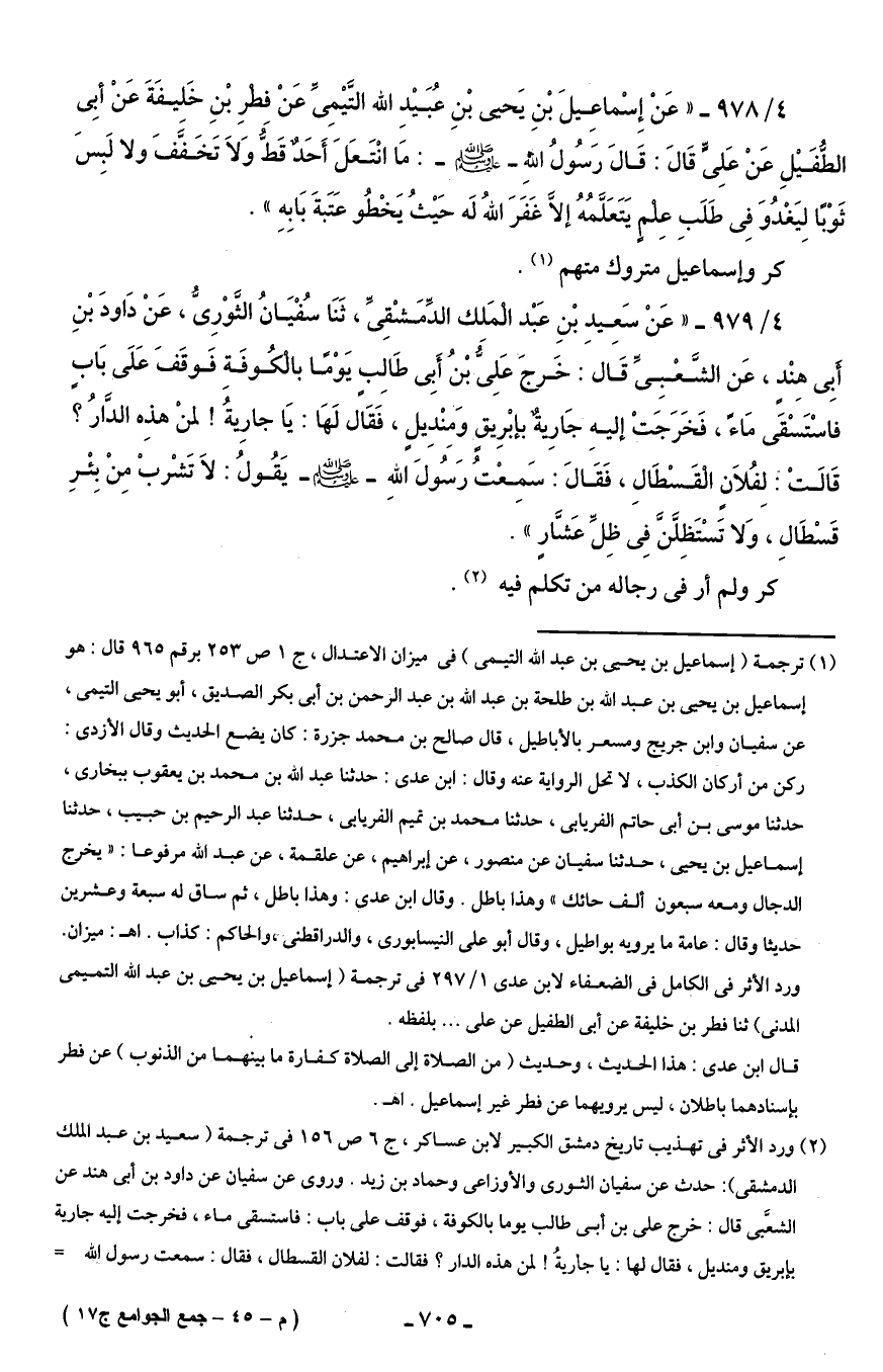 4/ 978 - "عَنْ إِسْماعِيلَ بْنِ يَحيى بْنِ عُبَيْدِ الله التَّيْمِىِّ عَنْ فِطْرِ بْنِ خَليفَةَ عَنْ أبِى الطُّفَيْلِ عَنْ عَلِىٍّ قَالَ: قَالَ رَسُولُ اللهِ - صلى الله عليه وسلم -: مَا انْتَعَلَ أَحَدٌ قَطُّ وَلاَ تَخَفَّفَ ولا لَبِسَ ثَوْبًا لِيَغْدُوَ فِى طَلَبِ عِلمٍ يَتَعَلَّمُهُ إلَّا غَفَرَ الله لَه حَيْثُ يَخْطُو عَتَبةَ بَابِهِ".