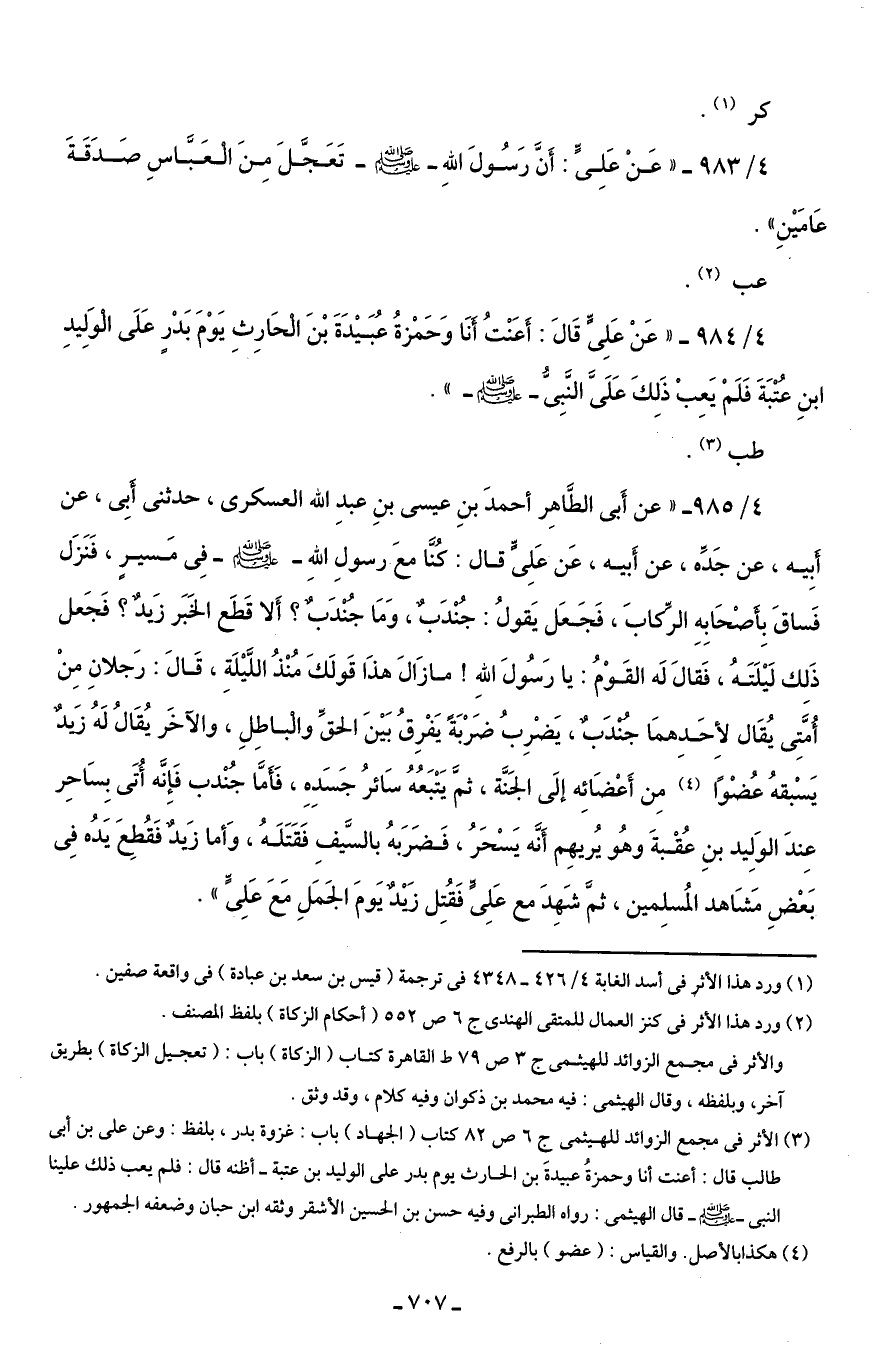4/ 985 - "عن أَبى الطَّاهِر أحمدَ بنِ عيسى بنِ عبدِ الله العسكرى، حدثنى أَبِى، عن أَبِيه، عن جَدِّه، عن أَبيه، عَن عَلِىٍّ قال: كُنَّا معَ رسولِ اللهِ - صلى الله عليه وسلم - فِى مَسيرٍ، فَنَزَل فَساقَ بِأَصْحَابِهِ الركّابَ، فَجَعَل يَقولُ: جُنْدَبٌ، وَمَا جُنْدَبٌ؟ أَلا قَطَع الخَبَر زَيدٌ؟ فَجَعل ذَلِك لَيْلَتَهُ، فَقالَ لَه القَوْمُ: يا رَسُولَ اللهِ! مازَالَ هذَا قَولَكَ مُنْذُ اللَّيْلَةِ، قَالَ: رَجلانِ مِنْ أُمَّتِى يُقَال لأِحَدِهمَا جُنْدَبٌ، يَضْرِبُ ضَرْبَةَ يَفْرِقُ بَيْنَ الحقِّ والْباطِلِ، والآخَر يُقَالُ لَهُ زَيادٌ يَسْبقهُ عُضْوًا (¬4) مِن أَعْضَائِه إلَى الجَنَّة، ثمَّ يَتْبَعُهُ سَائرُ جَسَدِهِ، فَأَمَّا جُنْدب فَإِنَّه أُتِى بِسَاحِر عِندَ الوَلِيد بنِ عُقْبةَ وهُو يُريهِم أَنَّه يَسْحَرُ، فَضَرَبهُ بالسَّيفِ فَقَتَلَهُ، وَأما زَيدٌ فَقُطِعَ يَدُه فِى بَعْضِ مَشَاهد المُسلِمين، ثمَّ شَهِدَ مع عَلِىٍّ فَقُتِل زَيْدٌ يَومَ الجَمَلِ مَعَ عَلِىٍّ".