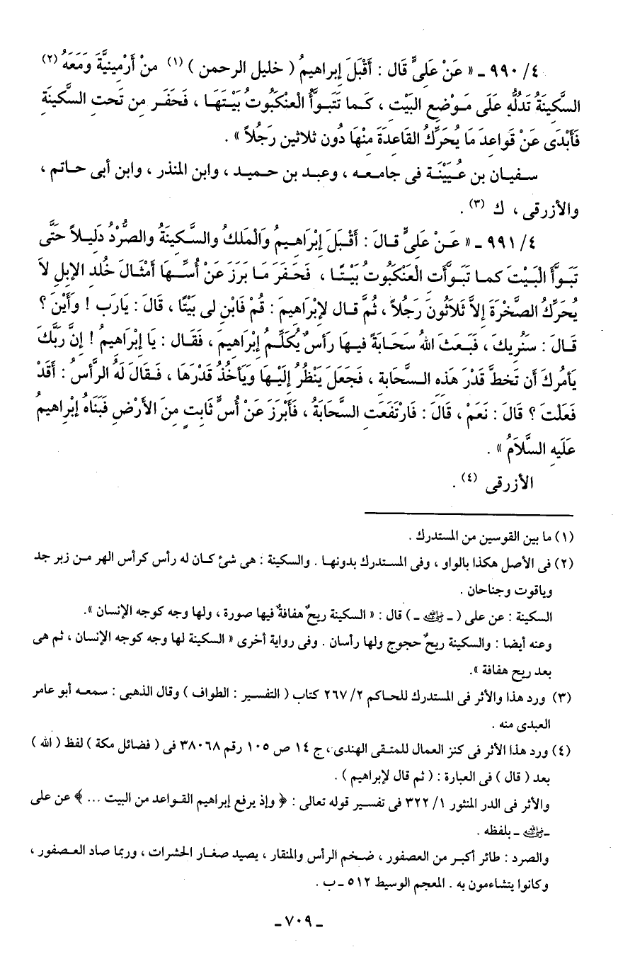 4/ 990 - "عَنْ عَلِىٍّ قَال: أَقْبَلَ إِبراهيمُ (خليل الرحمن) (¬1) منْ أَرْمِينيَّةَ وَمَعَهُ (¬2) السَّكِينَةُ تَدُلُّهِ عَلَى مَوْضِع البَيْتِ، كما تَتَبوَّأُ الْعنْكَبُوتُ بَيْتَهَا، فَحَفَر مِن تَحتِ السَّكينَةِ فَأَبْدَى عَنْ قَواعِدَ مَا يُحَرِّكُ القَاعِدَةَ مِنْهَا دُون ثلاثين رَجُلًا".