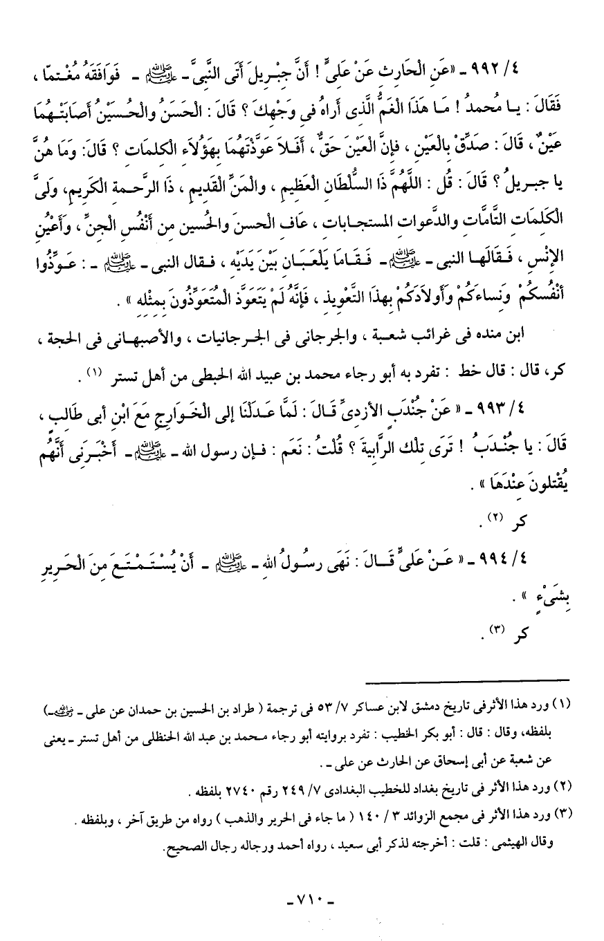 4/ 992 - "عَنِ الْحَارِث عَنْ عَلِىٍّ أَنَّ جِبْرِيلَ أَتَى النَّبِىَّ - صلى الله عليه وسلم - فَوَافَقَهُ مُغْتمّا، فَقَالَ: يا مُحمدُ! مَا هَذَا الْغَمُّ الَّذِى أَراهُ في وَجْهِكَ؟ قَالَ: الْحَسَنُ والْحُسَيْنُ أَصَابَتْهُمَا عَيْنٌ، قَالَ: صَدِّقْ بِالْعَيْنِ، فإنَّ الْعَيْنَ حَقٌّ، أَفَلاَ عَوَّذْتَهُمَا بِهَؤُلاَءِ الْكِلمَاتِ؟ قَالَ: وَمَا هُنَّ يا جبريلُ؟ قَالَ: قُل: اللَّهُمَّ ذَا السُّلْطَانِ الْعَظِيمِ، والْمَنِّ الْقَدِيمِ، ذَا الرَّحمةِ الْكَرِيمِ، وَلىَّ الْكَلِمَاتِ التَّامَّاتِ والدَّعواتِ المستجاباتِ، عَافِ الْحسنَ والحُسين مِن أَنْفُسِ الْجِنِّ، وَأَعْيُنِ الإِنْسِ، فَقَالَها النبي - صلى الله عليه وسلم - فَقَامَا يَلْعَبَانِ بَيْنَ يَدَيْهِ، فقال النبي - صلى الله عليه وسلم -: عَوِّذُوا أنْفُسكُمْ وَنِساءَكُمْ وَأَولاَدَكُمْ بِهذَا التَّعْوِيذِ، فَإنَّهُ لَمْ يَتَعَوَّذ الْمُتَعَوِّذُونَ بِمِثْلِهِ".