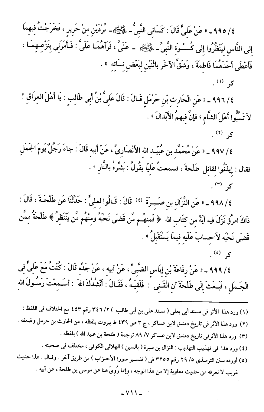 4/ 999 - "عَنْ رِفَاعَةَ بْنِ إِيَاسٍ الضَّبِىِّ، عَنْ أبيهِ، عَنْ جَدِّهِ قَالَ: كنْتُ مَعَ عَلِىٍّ فِى الْجَمَلِ، فَبَعَثَ إِلَى طَلْحَةَ أنِ الْقَنِى: فَلَقِيَهُ، فَقَالَ: أَنْشُدُكَ اللهَ: أسَمِعْتَ رَسُولَ اللهِ