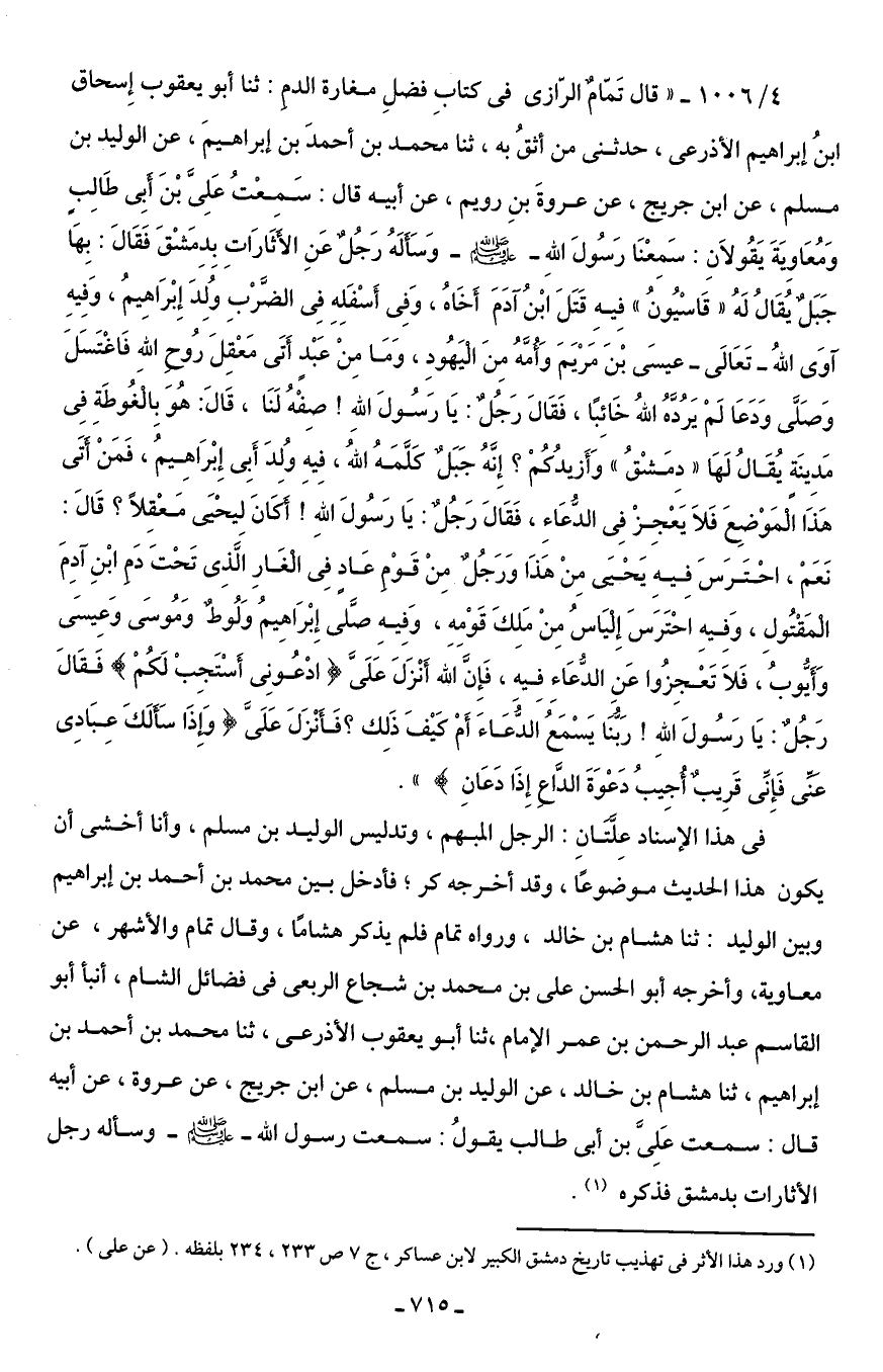 4/ 1006 - "قال تَمّامٌ الرّازى في كتابِ فضلِ مغارة الدمِ: ثنا أبو يعقوب إِسحاق ابنُ إبراهيم الأذرعى، حدثنى من أثقُ به، ثنا محمد بن أحمدَ بن إبراهيمَ، عن الوليد بن مسلم، عن ابن جريج، عن عروةَ بنِ رويم، عن أبيه قال: سَمعْتُ عَلِىَّ بْنَ أَبِى طَالِبٍ وَمُعَاوِيَةَ يَقُولاَنِ: سَمِعْنَا رَسُولَ اللهِ - صلى الله عليه وسلم - وَسَأَلَهُ رَجُلٌ عَنِ الأَثَارَاتِ بِدِمَشْقَ فَقَالَ: بِهَا جَبَلٌ يُقَالُ لَهُ "قَاسْيُونُ" فِيهِ قَتَلَ ابْنُ آدَمَ أَخَاهُ، وَفِى أَسْفَلِهِ فِى الضَّرْبِ وُلِدَ إِبْرَاهِيمُ، وَفِيهِ آوَى الله - تَعَالَى - عيسَى بْنَ مَرْيَمَ وَأُمَّهُ مِنَ الْيَهُودِ، وَمَا مِنْ عَبْدٍ أَتَى مَعْقِلَ رُوحِ الله فَاغْتَسَلَ وَصَلَّى وَدَعَا لَمْ يَرُدَّهُ الله خَائِبًا، فَقَالَ رَجُلٌ: يَا رَسُولَ اللهِ! صِفْهُ لَنَا، قَالَ: هُوَ بِالْغُوطَةِ فِى مَدِينَةٍ يُقَالُ لَهَا "دِمَشْقُ" وَأَزيدُكُمْ؟ إِنَّهُ جَبَلٌ كَلَّمَهُ الله، فِيهِ وُلدَ أَبِى إِبْرَاهِيمُ، فَمَنْ أَتَى هَذَا الْمَوْضِعَ فَلاَ يَعْجِزْ فِى الدُّعَاءِ، فَقَالَ رَجُلٌ: يَا رَسُولَ اللهِ! أَكَانَ لِيحْيَى مَعْقِلًا؟ قَالَ: نَعَمْ، احْتَرَسَ فِيهِ يَحْيَى مِنْ هَذَا وَرَجُلٌ مِنْ قَوْمِ عَادٍ فِى الْغَارِ الَّذِى تَحْتَ دَمِ ابْنِ آدِمَ الْمَقْتُولِ، وَفِيهِ احْتَرَسَ إِلْيَاسُ مِنْ مَلِكَ قَوْمِهِ، وَفِيهِ صَّلى إِبْرَاهِيمُ وَلُوطٌ وَمُوسَى وَعِيسَى وَأَيُّوبُ، فَلاَ تَعْجِزُوا عَنِ الدُّعَاءِ فِيه، فَإِنَّ الله أَنْزَلَ عَلَىَّ {ادْعُونِى أَسْتَجِبْ لَكُمْ} فَقَالَ رَجُلٌ: يَا رَسُولَ اللهِ! رَبُّنَا يَسْمَعُ الدُّعَاءَ أَمْ كيْفَ ذَلِك؟ فَأَنْزَلَ عَلَىَّ {وَإِذَا سَأَلَكَ عِبَادِى عَنِّى فَإِنِّى قَرِيبٌ أُجِيبُ دَعْوَةَ الدَّاع إِذَا دَعَانِ} ".