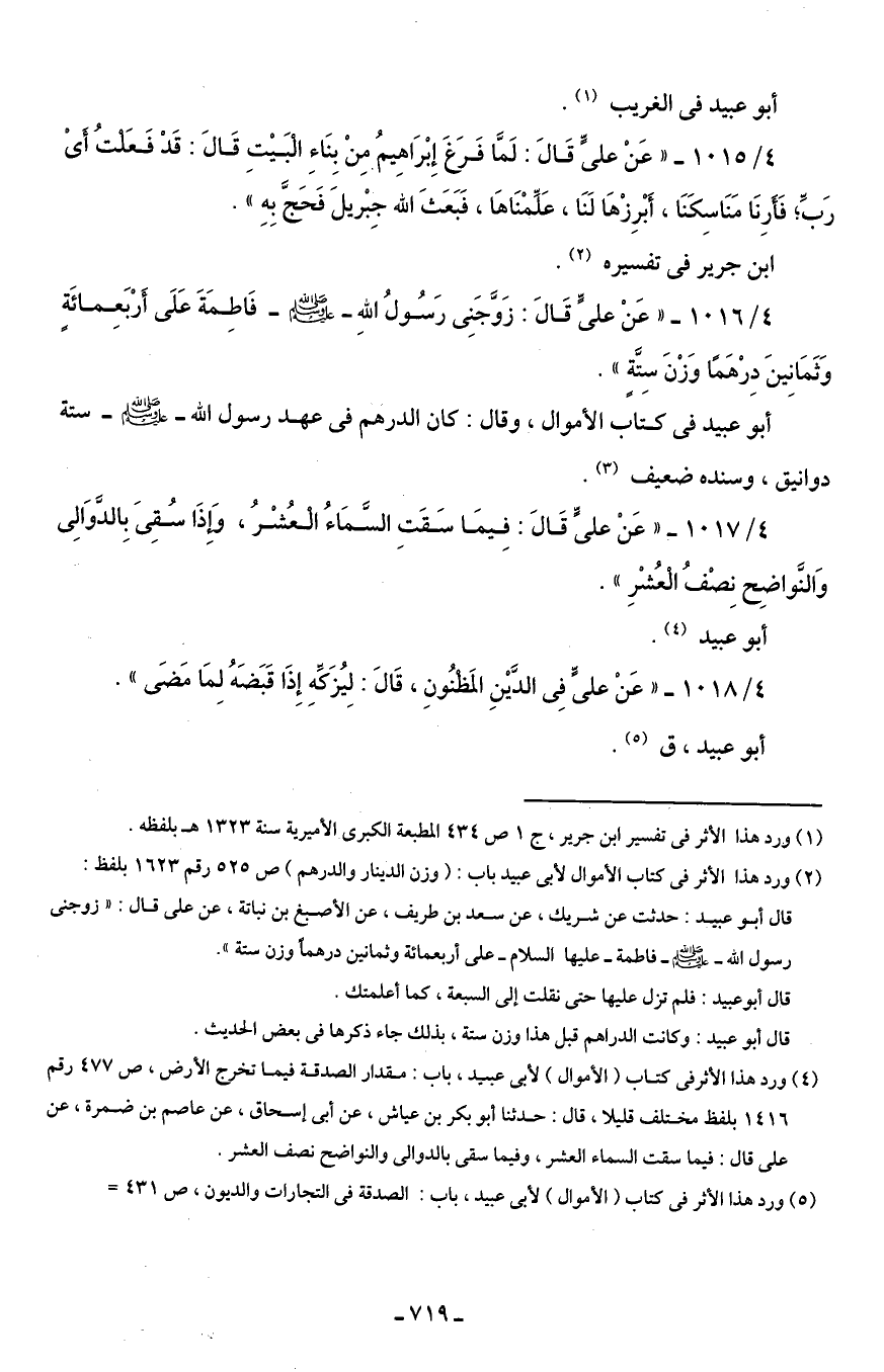 4/ 1017 - "عَنْ عليٍّ قَالَ: فِيمَا سَقَتِ السَّمَاءُ الْعُشْرُ، وَإِذَا سُقِىَ بِالدَّوَالِى وَالنَّواضِح نِصْفُ الْعُشْرِ".