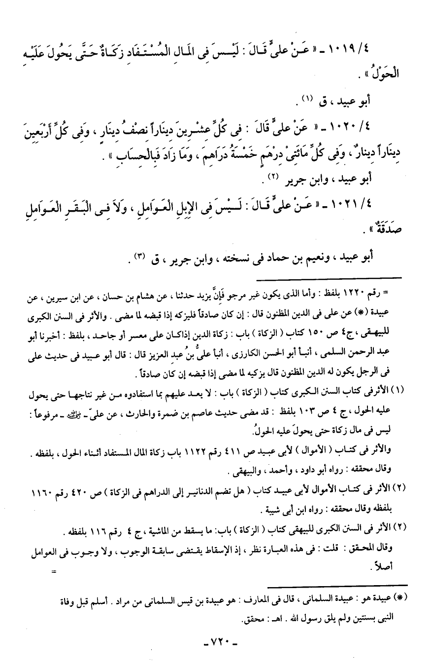 4/ 1019 - "عَنْ علىٍّ قَالَ: لَيْسَ فِى المَالِ الْمُسْتَفَاد زَكَاةٌ حَتَّى يَحُولَ عَلَيْهِ الْحَوْلُ".