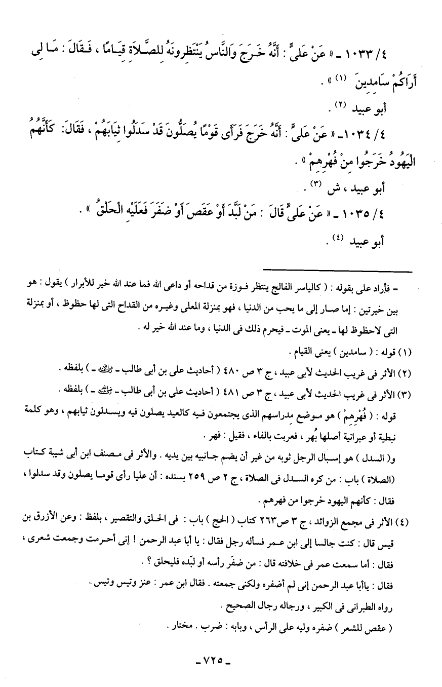 4/ 1034 - "عَنْ عَلىٍّ: أَنَّهُ خَرَجَ فَرَأَى قَوْمًا يُصَلُّونَ قَدْ سَدَلُوا ثِيَابَهُمْ، فَقَالَ: كَأَنَّهُمُ الْيَهُودُ خَرَجُوا مِنْ فُهْرِهِمْ".