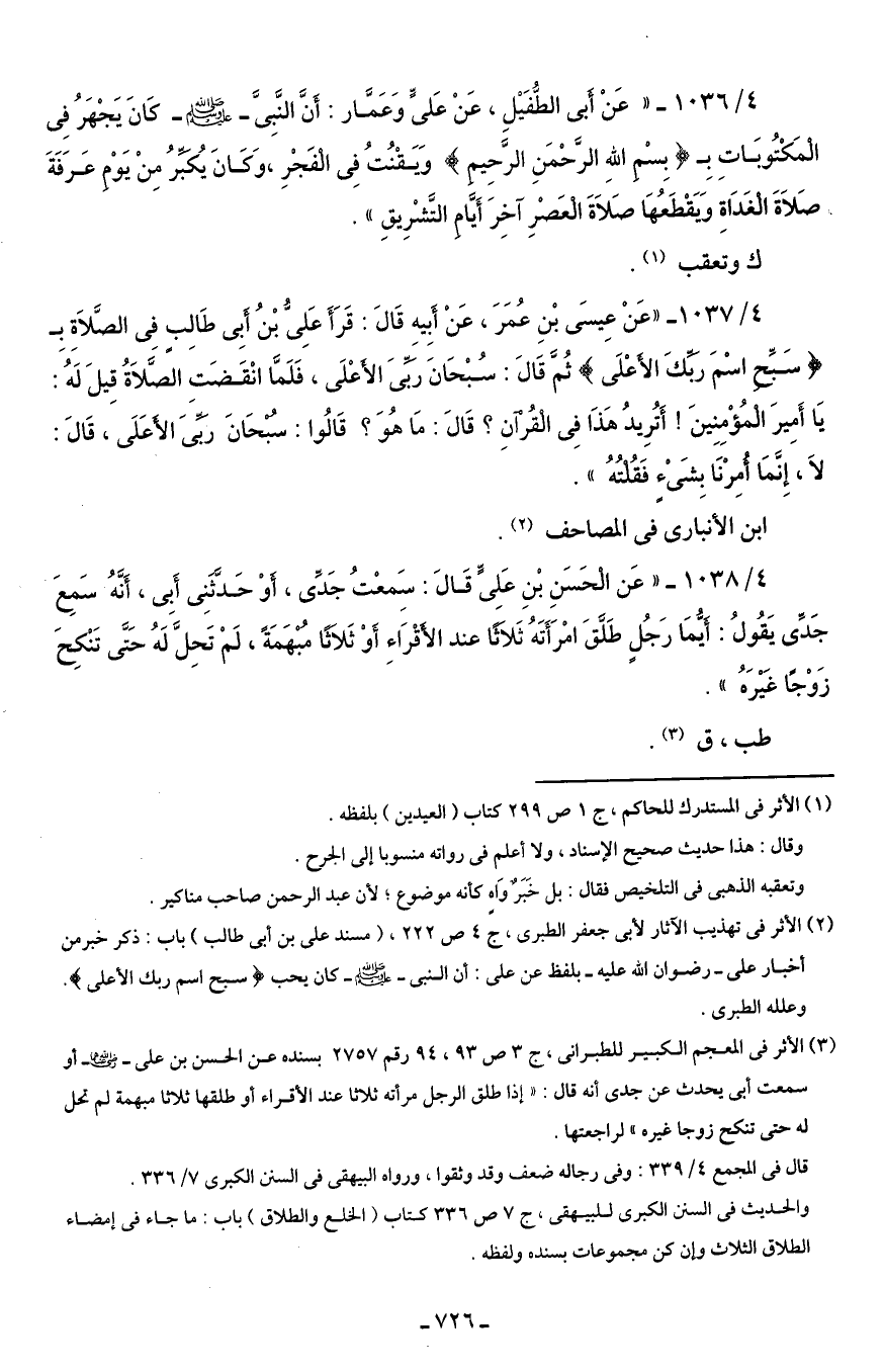 (¬2) الأثر في تهذيب الآثار لأبى جعفر الطبرى، ج 4 ص 222، (مسند على بن أبى طالب) باب: ذكر خبر من أخبار على - رضوان الله عليه - بلفظ عن على: أن النبي - صلى الله عليه وسلم - كان يحب {سبح اسم ربك الأعلى}. وعلله الطبرى.