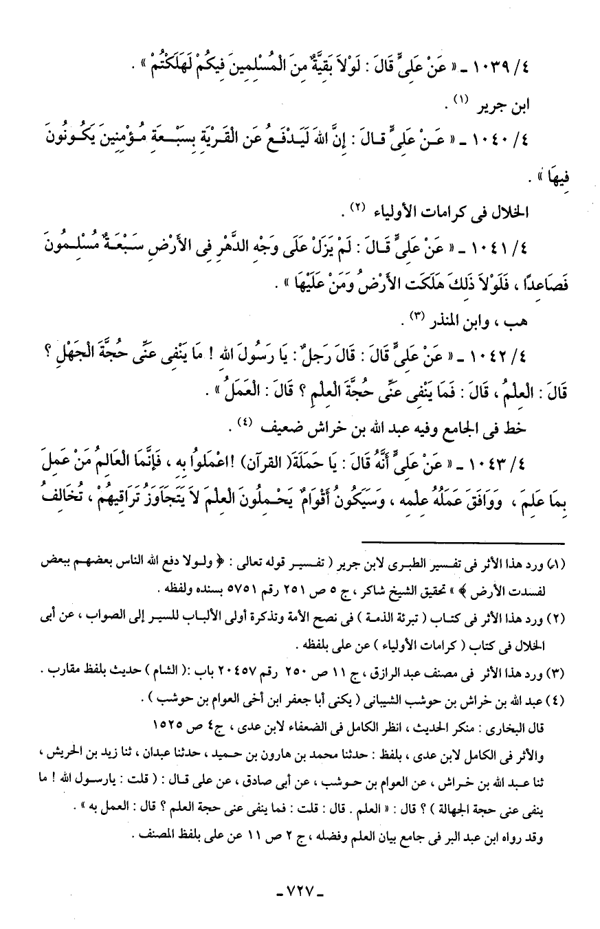 4/ 1041 - "عَنْ عَلِىٍّ قَالَ: لَمْ يَزَلْ عَلَى وَجْهِ الدَّهْرِ فِى الأَرْضِ سَبْعَةٌ مُسْلِمُونَ فَصَاعِدًا، فَلَوْلاَ ذَلِكَ هَلَكَت الأَرْضُ وَمَنْ عَلَيْهَا".