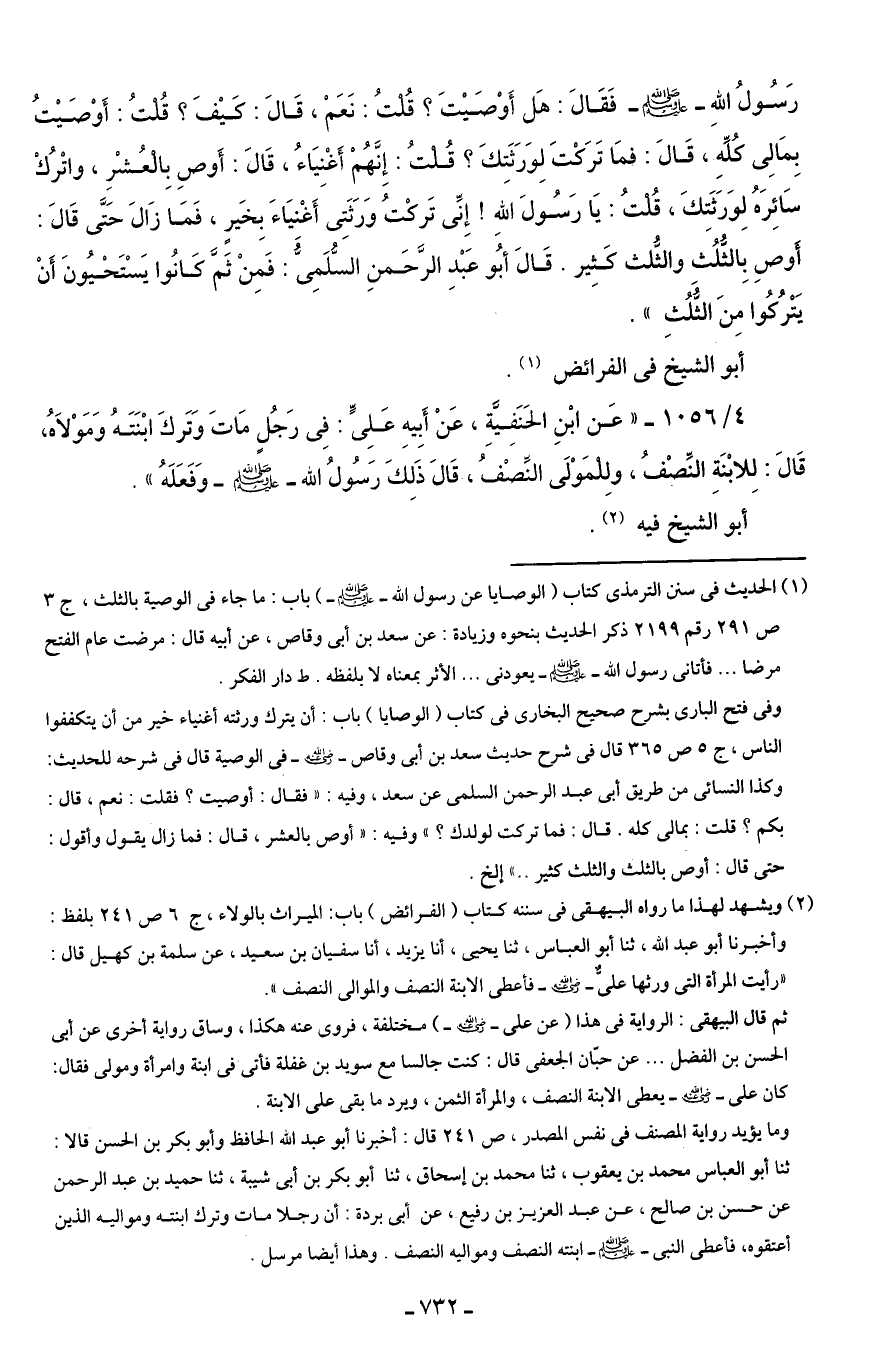 رَسُولُ اللهِ - صلى الله عليه وسلم - فَقَالَ: هَل أَوْصَيْتَ؟ قُلتُ: نَعَمْ، قَالَ: كيْفَ؟ قُلْتُ: أَوْصَيْتُ بِمَالِى كُلِّهِ، قَالَ: فمَا تَرَكْتَ لِوَرَثَتِكَ؟ قُلْتُ: إِنَّهُمْ أَغْنِيَاءُ، قَالَ: أَوصِ بِالْعُشْرِ، واتْرُكْ سَائِرَهُ لِوَرَثَتِكَ، قُلْتُ: يَا رَسُولَ اللهِ! إِنِّى تَركْتُ وَرَثَتِى أَغْنيَاءَ بِخَيرٍ، فَمَا زَالَ حَتَّى قَالَ: أَوصِ بِالثُّلُث والثُّلث كَثِير. قَالَ أبُو عَبْدِ الرَّحَمنِ السُّلَمِىَّ: فَمِنْ ثَمَّ كَانُوا يَسْتَحْيُونَ أَنْ يَتْرُكُوا مِنَ الثُّلُثِ".