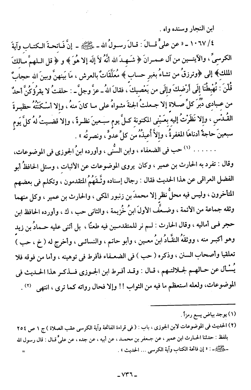 (¬2) الحديث في الموضوعات لابن الجوزى، باب: (في قراءة الفاتحة وآية الكرسى عقب الصلاة) ج 1 ص 254 بلفظ: حدثنا الحارث ابن عمير، عن جعفر بن محمد، عن أبيه، عن جده، عن علىٍّ قال: قال رسول الله - صلى الله عليه وسلم -: "إن فاتحة الكتاب وآية الكرسى ... الحديث". =