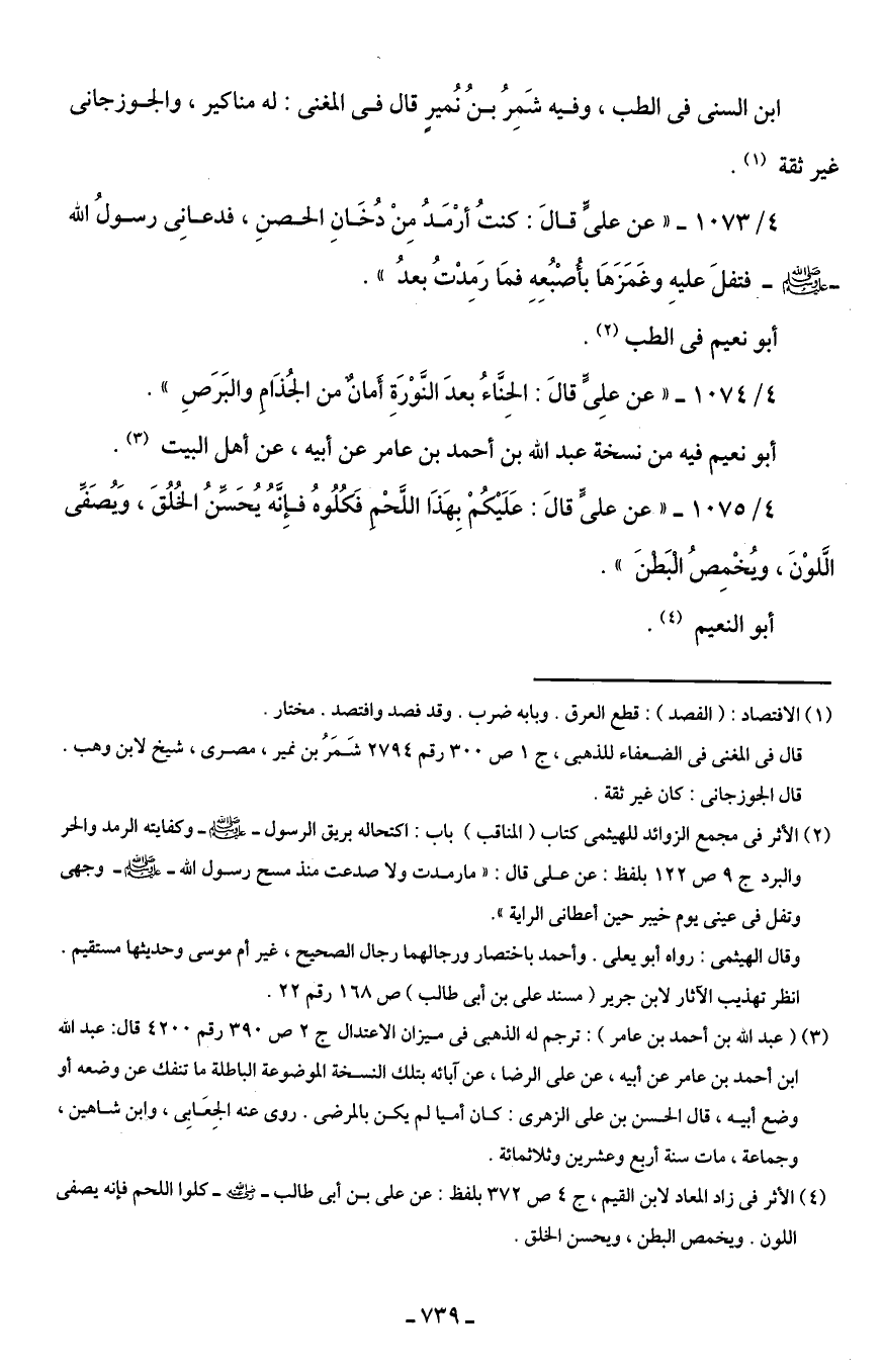 4/ 1074 - "عن علِىٍّ قالَ: الحِنَّاءُ بعدَ النَّوْرَةِ أَمانٌ من الجُذَامِ والبَرَصِ".