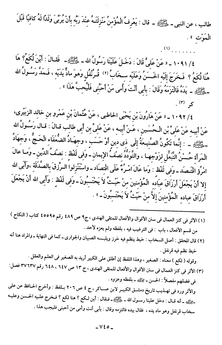 4/ 1092 - " عَنْ هَارُونَ بْنِ يَحْيَى الحاطبى، عَنْ عُثْمانَ بْنِ عَمْرو بنِ خالِد الزبَيْرى، عَنْ أَبيهِ عَنْ عَلِىِّ بْن الْحُسَينِ، عَنْ أَبِيهِ، عَنْ عَلِىِّ بِن أَبِى طالِب قالَ: قال رَسُولُ الله - صلى الله عليه وسلم -: إِنَّما تَكُونُ الصَّنِيعَةُ إِلَى ذى دِينٍ أَوْ حَسَبٍ، وجِهَادُ الضُّعَفَاءِ الْحَجُّ، وَجِهَادُ الْمَرأَةِ حُسْنُ التَّبَعُّلِ لِزَوْجِها، والتَّوَدُّدُ نصْفُ الإِيمانِ -وَفِى لَفْظٍ: نِصْفُ الدِّينِ- وَما عالَ امْرُؤ اقْتَصَد -وَفِى لَفْطٍ: وَما عَالَ امْرُءٌ عَلَى اقْتِصَاد- واسْتَنْزِلوا الرِّزقَ بِالصَّدَقَةِ، وَأَبَى الله إِلا أَنْ يَجْعَلَ أَرْزَاقَ عِبَادِه الْمُؤْمِنينَ مِنْ حَيْثُ لاَ يَحْتَسِبُونَ -وَفِى لَفْظٍ: وَأَبِى الله أَنْ يَجْعَلَ أَرْزَاقَ عِبادهِ الْمُؤْمِنِينَ إِلَّا مِنْ حَيْثُ لاَ يَحْتَسِونَ-".