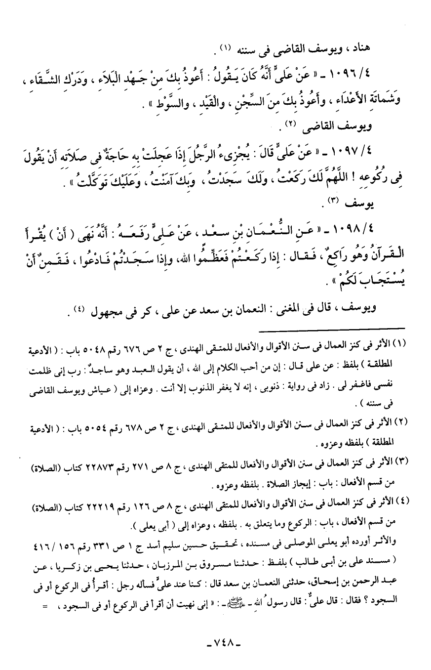 4/ 1096 - " عَنْ عَلىٍّ أَنَّهُ كَانَ يَقُولُ: أَعُوذُ بِكَ مِنْ جَهْدِ الْبَلاَءِ، وَدَرْكِ الشَّقَاءِ، وَشَماتَةِ الأَعْدَاءِ، وأَعُوذُ بِكَ مِنَ السِّجْنِ، والْقَيْد، والسَّوْط ".
