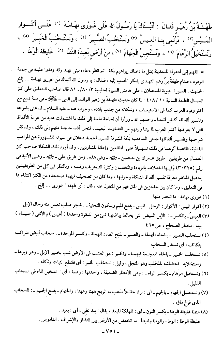 = اللهم إنى أدعوك للمدينة بمثل ما دعاك إبراهيم لمكة. ثم انظر دعاءه لبنى نهد وقد وفدوا عليه في جملة الوفود، فقام طهفةُ بنُ رهم النهدى يشكو الجدب إليه، فقال: يا رسول الله أتيناك من غورى تهامة ... إلخ الحديث. السيرة النبوية للدحلان، على هامش السيرة الحلبية 3/ 80/، 81 قال صاحب التعليق على كنز العمال الطبعة الثانية 10/ 408: لما كان حديث طهفةَ بن زهير الوافد إلى النبي - صلى الله عليه وسلم - في سنة تسع مع أكثر وفود العرب كما في الاستيعاب، وشكاته من جدب بلاده، وجوابه عنه - عليه السلام - قد عنى بشرحه وتفسير ألفاظه أكابر أئمتنا - رحمهم الله - ورأوا أن الحاجة ماسة إلى ذلك لما اشتملت عليه من غرابة الألفاظ التى لا يعرفها أكثر العرب لما بيننا وبينهم من التفاوت البعيد، فنحن أشد حاجة منهم إلى ذلك، وفد نقل شرحها وتفسير ألفاظها مفتى الشافعية بمكة المشرفة السيد أحمد دحلان في سيرته المشهورة عن المواهب اللدنية، فاقتفينا أثرهما في ذلك تسهيلًا على المطالعين وإعانة للشاردين، وقد أورد تلك الشكاة صاحب كنز العمال من طريقين: طريق عمران بن حصين - رضي الله عنه - وهى هذه، ومن طريق على - رضي الله عنه - وهى الآتية في رقم (30325) وفيها اختلاف بالزيادة والنقصان وكثرة التحريف وقلته، وبالنظر في كل من الطريقيتين يحصل للناظر معرفة تفسير ألفاظ الشكاة وجوابها، وما كان من تصحيف فيهما صححناه من الكنز اكتفاء بما في التعليق، وما كان بين حاجزين في المتن فهو من المنقول عنه، قال: أى طهفة! غورى ... إلخ.