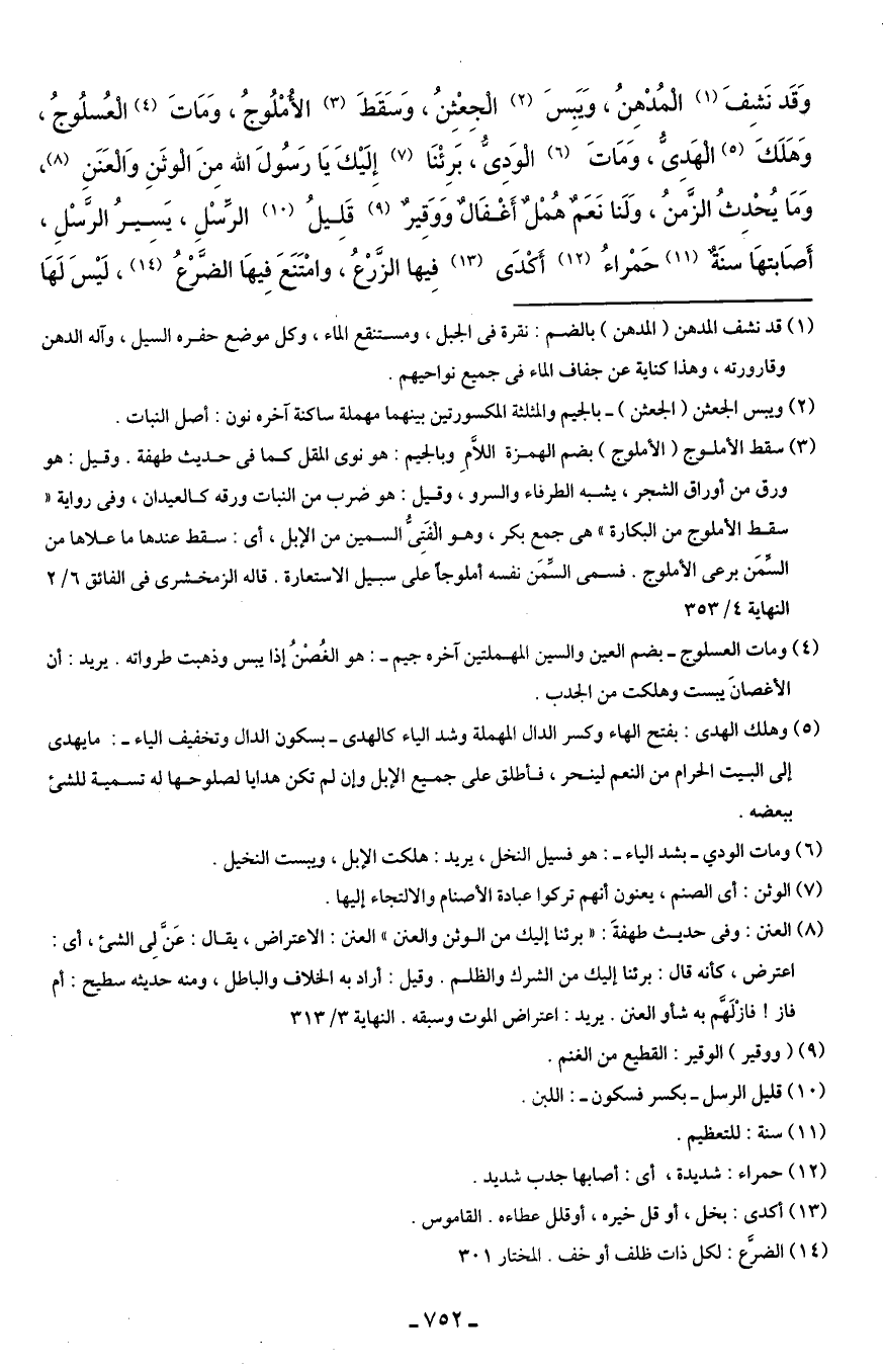 وَقَد نَشِفَ (¬1) الْمُدْهِنُ، وَيَبِسَ (¬2) الْجِعْثِنُ، وَسَقَطَ (¬3) الأُمْلُوجُ، وَمَاتَ (¬4) الْعُسلُوجُ، وَهَلَكَ (¬5) الْهَدِىُّ، وَمَاتَ (¬6) الْوَدِىُّ، بَرِئْنَا (¬7) إِلَيْكَ يَا رَسُولَ الله مِنَ الْوثَنِ وَالْعَنَنِ (¬8)، وَمَا يُحْدِثُ الزَّمنُ، وَلَنا نَعَمٌ هُمْلٌ أَغْفَالٌ وَوَقِيرٌ (¬9) قَلِيلُ (¬10) الرِّسْلِ، يَسِيرُ الرَّسْلِ، أَصَابتهَا سنَةٌ (¬11) حَمْراءُ (¬12) أَكْدَى (¬13) فِيها الزَّرْعُ، وامْتَنَعَ فِيهَا الضَّرْعُ (¬14)، لَيْسَ لَهَا