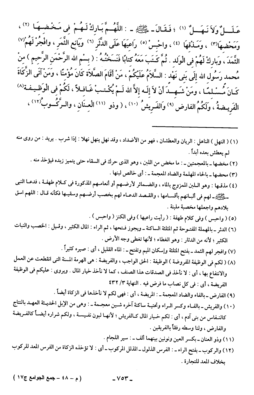 عَلَلٌ وَلاَ نَهَلٌ (¬1)؛ فَقَالَ - صلى الله عليه وسلم -: اللَّهُمَّ بَارِكْ لَهُمْ فِى مَخْضِهَا (¬2)، وَمَحْضِهَا (¬3)، وَمَذْقِهَا (¬4)، واحْبِسْ (¬5) رَاعِيَهَا عَلَى الدَّثَرِ (¬6) وَيَانِع الثَّمَرِ، وافْجُرْ لَهُمْ (¬7) الثَّمَدَ، وَبارِكْ لَهُمْ فِى الْوَلدِ. ثُمَّ كَتَبَ مَعَهُ كتابًا فَنَسَخْتُهُ: (بِسْم الله الرَّحْمَنِ الرَّحِيم) مِنْ مُحمد رَسُولِ الله إِلَى بَنِى نَهْدٍ: السَّلاَمُ عَلَيْكُمْ، مَنْ أَقَامَ الصَّلاَة كَانَ مُؤْمِنًا، وَمَنْ آتَى الزَّكَاةَ كَانَ مُسْلِمًا، ومَنْ شَهِدَ أَنْ لاَ إِلَه إِلَّا الله لَمْ يُكْتبْ غَافلًا، لَكُمْ فِى الْوَظِيفة (¬8) الْفَرِيضةُ، وَلَكُمُ الفارض (¬9) وَالفَرِيشُ (¬10)، (وذو (¬11) الْعِنَانِ، والرَّكُوبُ (¬12)،