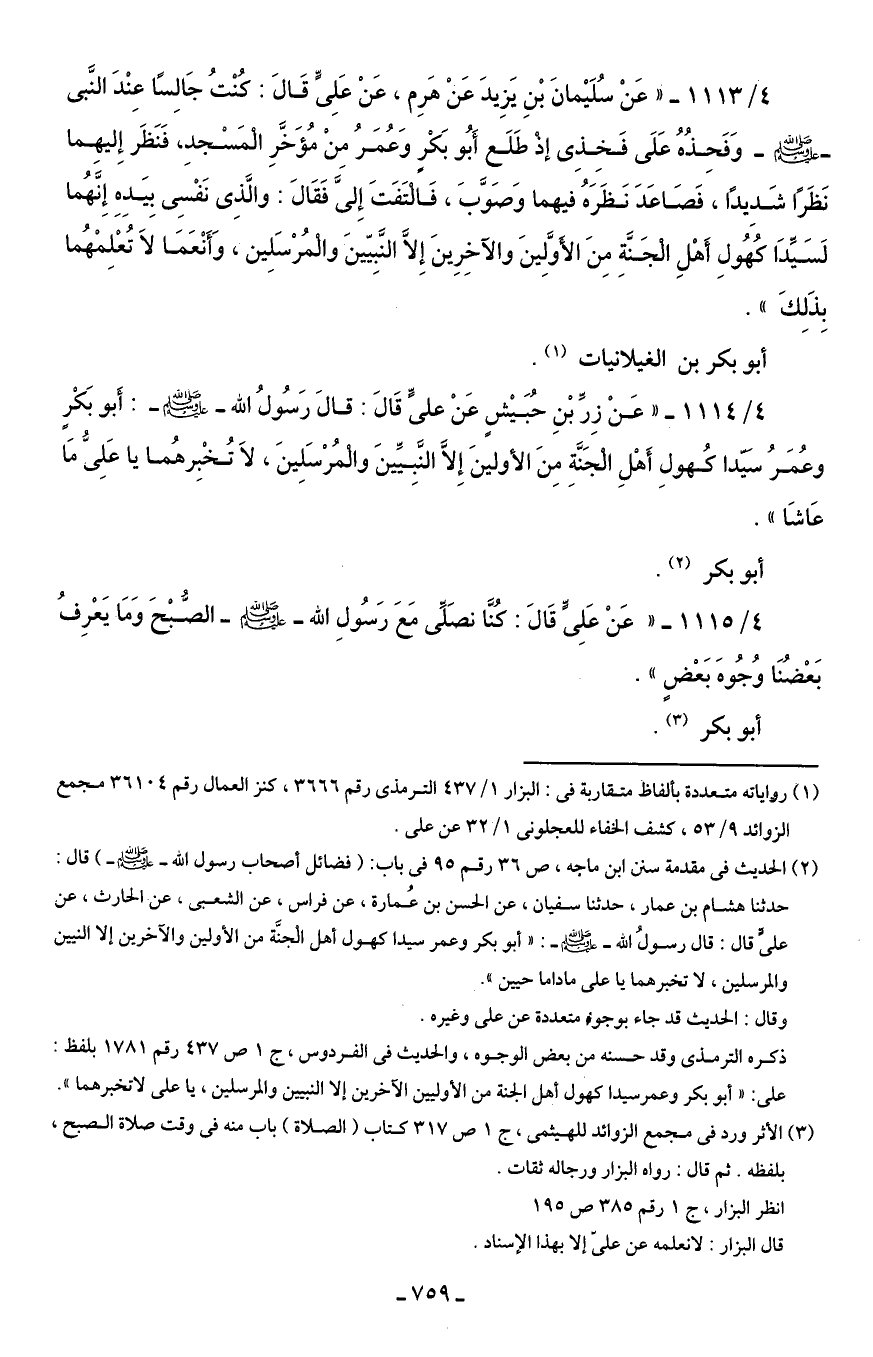 4/ 1114 - " عَنْ زِرِّ بْنِ حُبَيْشٍ عَنْ عليٍّ قَالَ: قالَ رَسُولُ الله - صلى الله عليه وسلم -: أبو بَكْر وعُمَرُ سَيّدا كُهولِ أَهْلِ الْجَنَّةِ مِنَ الأولينَ إِلَّا النَّبِيِّينَ والْمُرْسَلِينَ، لاَ تُخْبِرهُما يا عَلِىُّ مَا عَاشَا".