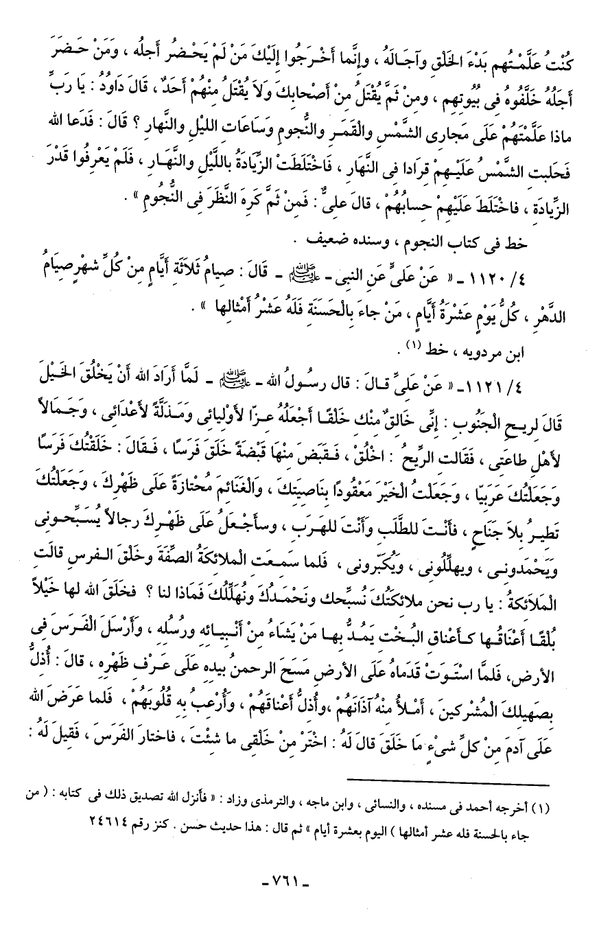 4/ 1120 - " عَنْ عَلىٍّ عَنِ النبِيّ - صلى الله عليه وسلم - قَالَ: صِيامُ ثَلاَثَةِ أَيَّامٍ مِنْ كلِّ شهْرٍ صيَامُ الدَّهْرِ، كلُّ يَوْمٍ عَشْرَةُ أَيَّامٍ، مَنْ جاءَ بِالْحَسَنَةِ فَلَهُ عَشْرُ أَمْثالِها ".