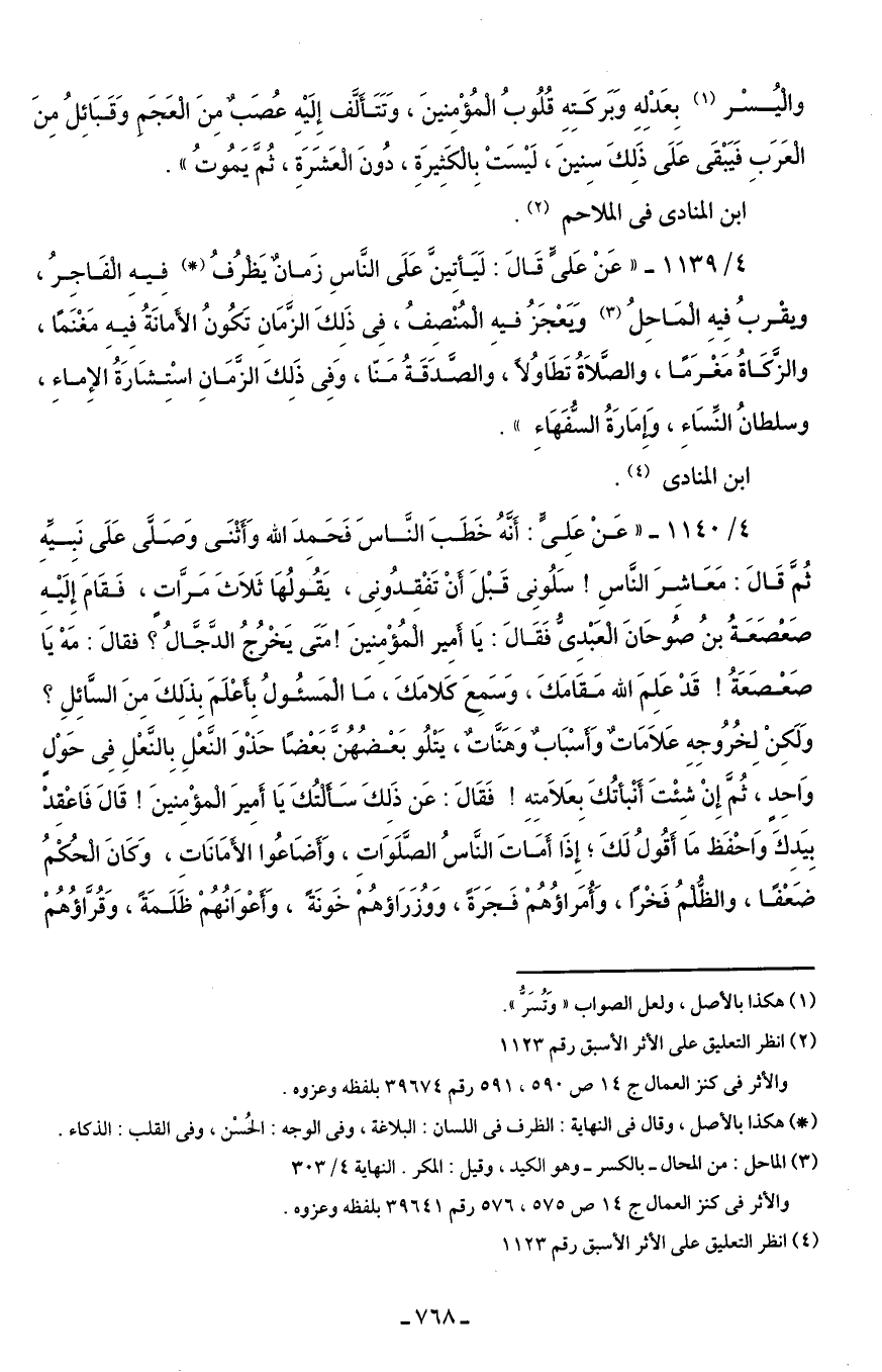 4/ 1140 - " عَنْ عَلِىٍّ: أَنَّهُ خَطَبَ النَّاسَ فَحَمِدَ الله وَأَثْنَى وَصَلَّى عَلَى نَبِيِّهِ ثُمَّ قَالَ: مَعَاشِرَ النَّاسِ! سَلُونِى قَبْلَ أَنْ تَفْقدُونِى، يَقُولُهَا ثَلاَثَ مَرَّاتٍ، فَقَامَ إِلَيْهِ صَعْصَعَةُ بنُ صُوحَانَ الْعَبْدِى فَقَالَ: يَا أَمِير الْمُؤْمِنينَ! مَتَى يَخْرُجُ الدَّجَّالُ؟ فقالَ: مَهْ يَا صَعْصَعَةُ! قَدْ عَلِمَ الله مَقَامَكَ، وَسَمِعَ كَلامَكَ، مَا الْمَسئُولُ بِأَعْلَمَ بِذَلِكَ مِنَ السَّائِلِ؟ وَلَكِنْ لِخُرُوجِهِ عَلاَمَاتٌ وَأَسْبَابٌ وَهَنَّاتٌ، يَتْلُو بَعْضُهُنَ بَعْضًا حَذْوَ النَّعْلِ بِالنَّعْلِ فِى حَوْلٍ وَاحِدٍ، ثُمَّ إِنْ شِئْتَ أَنْبأتُكَ بِعَلاَمتِهِ! فَقَالَ: عَن ذَلِكَ سَأَلْتُكَ يَا أَمِيرَ الْمؤْمِنينَ! قَالَ فَاعْقدْ بِيَدِكَ وَاحْفَظ مَا أَقُولُ لَكَ؛ إِذَا أَمَاتَ النَّاسُ الصَّلَوَاتِ، وَأَضَاعُوا الأَمَانَاتِ، وَكَانَ الْحُكمُ ضَعْفًا، والظُّلْمُ فَخْرًا، وَأُمَراؤهُمْ فَجَرَةً، وَوُزَرَاؤهُمْ خَونَةً، وَأَعْوَانُهُمْ ظَلَمَةً، وَقُرَّاؤهُمْ