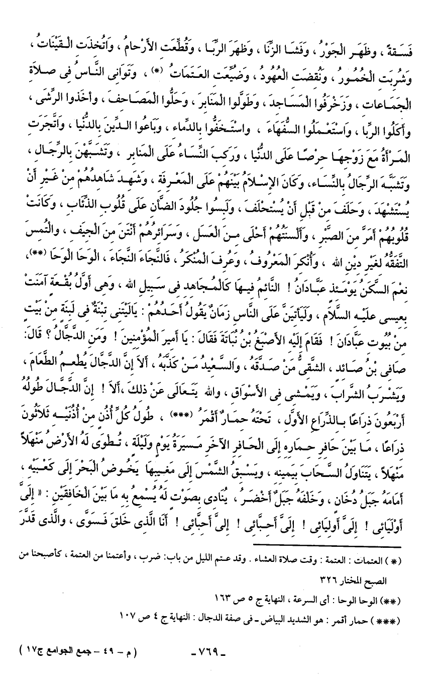 فَسَقةً، وظَهَر الْجَوْرُ، وَفَشَا الزِّنَا، وَظهَرَ الرِّبا، وَقُطِّعَتِ الأَرْحامُ، وَاتُّخذَتِ الْقَيْنَاتُ، وَشُرِبَتِ الْخُمُورُ، وَنُقِضَتِ الْعُهُودُ، وَضُيِّعَتِ العَتَمَاتُ (*)، وَتَوَانِى النَّاسُ فِى صلاَةِ الْجَمَاعاتِ، وَزَخْرَفُوا الْمَسَاجِدَ، وَطَوَّلوا الْمَنَابِرَ، وَحَلُّوا الْمَصَاحِفَ، وأخَذوا الرِّشَى، وأَكَلوُا الرِّبا، وَاسْتَعْمَلُوا السُّفَهَاءَ، واسْتَخَفُّوا بالدِّماءِ، وَبَاعُوا الدِّينَ بِالدُّنْيا، وَاتَّجَرَتِ الْمَرْأَةُ مَعَ زَوْجِهَا حِرْصًا عَلَى الدُّنْيا، وَرَكِبَ النِّسَاءُ عَلَى الْمَنابِر، وَتَشَبَّهْنَ بِالرِّجَالِ، وَتَشَبَّهَ الرِّجَالُ بِالنِّسَاء، وَكَانَ الإِسْلاَمُ بَيْنَهُمْ عَلَى الْمَعْرِفَة، وَشَهِدَ شَاهِدُهُمْ مِنْ غَيْرِ أَنْ يُسْتَشْهَدَ، وَحَلَفَ مِنْ قَبْلِ أَنْ يُسْتحْلَفَ، وَلَبِسُوا جُلُودَ الضَّأَنِ عَلَى قُلُوبِ الذِّئَابِ، وَكَانَتْ قُلُوبُهُمْ أَمَرَّ مِنَ الصَّبْرِ، وَأَلْسنَتُهُمْ أَحْلَى مِنَ الْعَسَل، وَسَرَائِرُهُمْ أَنْتَنَ مِنَ الْجِيَفِ، والْتُمِسَ التَّفَقُّهُ لِغَيْرِ دِيْنِ الله، وَأُنْكِرَ الْمَعْرُوفُ، وَعُرِفَ الْمُنْكَرُ، فَالنَّجَاءَ النَّجَاءَ، الْوَحَا الْوَحَا (* *)، نِعْمَ السَّكَنُ يَوْمَئذٍ عَبَّادَانُ! النَّائِمُ فِيهَا كَالْمُجَاهِدِ فِى سَبِيلِ الله، وَهِى أَوَّلُ بُقْعَةٍ آمَنَتْ بِعِيسى علَيْه السَّلاَم، وَلَيَأتِيَنَّ عَلَى النَّاسِ زَمَانٌ يَقُولُ أَحَدُهُمْ: يَالَيْتَنِى تِبْنَةٌ فِى لَبِنَةٍ مِنْ بَيْتٍ مِنْ بُيُوتِ عَبَّادَانَ! فَقَامَ إِلَيْهِ الأَصْبَغُ بْنُ نُبَاتَةَ فَقَالَ: يَا أَمِيرَ الْمُؤْمِنِينَ! وَمَنِ الدَّجَّالُ؟ قَالَ: صَافِى بْنُ صَائِدٍ، الشَّقِىُّ مَنْ صَدَّقَهُ، وَالسَّعيدُ مَنْ كَذَّبَهُ، أَلاَ إِنَّ الدَّجَّالَ يُطْعِمُ الطَّعَامَ، وَيَشْرَبُ الشَّرابَ، وَيَمْشِى فِى الأَسْوَاقِ، والله يَتَعَالَى عَنْ ذلِكَ، أَلاَ! إِنَّ الدَّجَّالَ طُولُهُ أَرْبَعُونَ ذِرَاعًا باِلذِّرَاعِ الأَوَّلِ، تَحْتَهُ حِمَارٌ أَقْمَرُ (* * *)، طُولُ كُلِّ أُذُنٍ مِنْ أُذُنَيْهِ ثَلاَثُونَ ذِرَاعًا، مَا بَيْنَ حَافِرِ حِمَارِهِ إِلَى الْحَافِرِ الآخَرِ مَسيَرَةُ يَوْمٍ وَلَيْلَةٍ، تُطْوَى لَهُ الأَرْضُ مَنْهَلًا مَنْهَلًا، يَتَنَاوَلُ السَّحَابَ بيَمينِه، ويَسْبِقُ الشَّمْسَ إِلَى مَغِيبِهَا يَخُوضُ الْبَحْرَ إِلَى كَعْبَيْهِ، أَمَامَهُ جَبَلُ دُخَانٍ، وَخَلْفَهُ جَبَلٌ أَخْضَرُ، يُنَادى بصَوْتٍ لَهُ يُسْمِعُ بِهِ مَا بَيْنَ الْخَافِقَيْنِ: " إِلَىَّ أَوْلَيَائِى! إِلَىَّ أَولِيَائِى! إِلَىَّ أَحِبَّائِى! إِلىَّ أحِبَّائِى! أَنَا الَّذِى خَلقَ فَسَوَّى، والَّذى قَدَّرَ