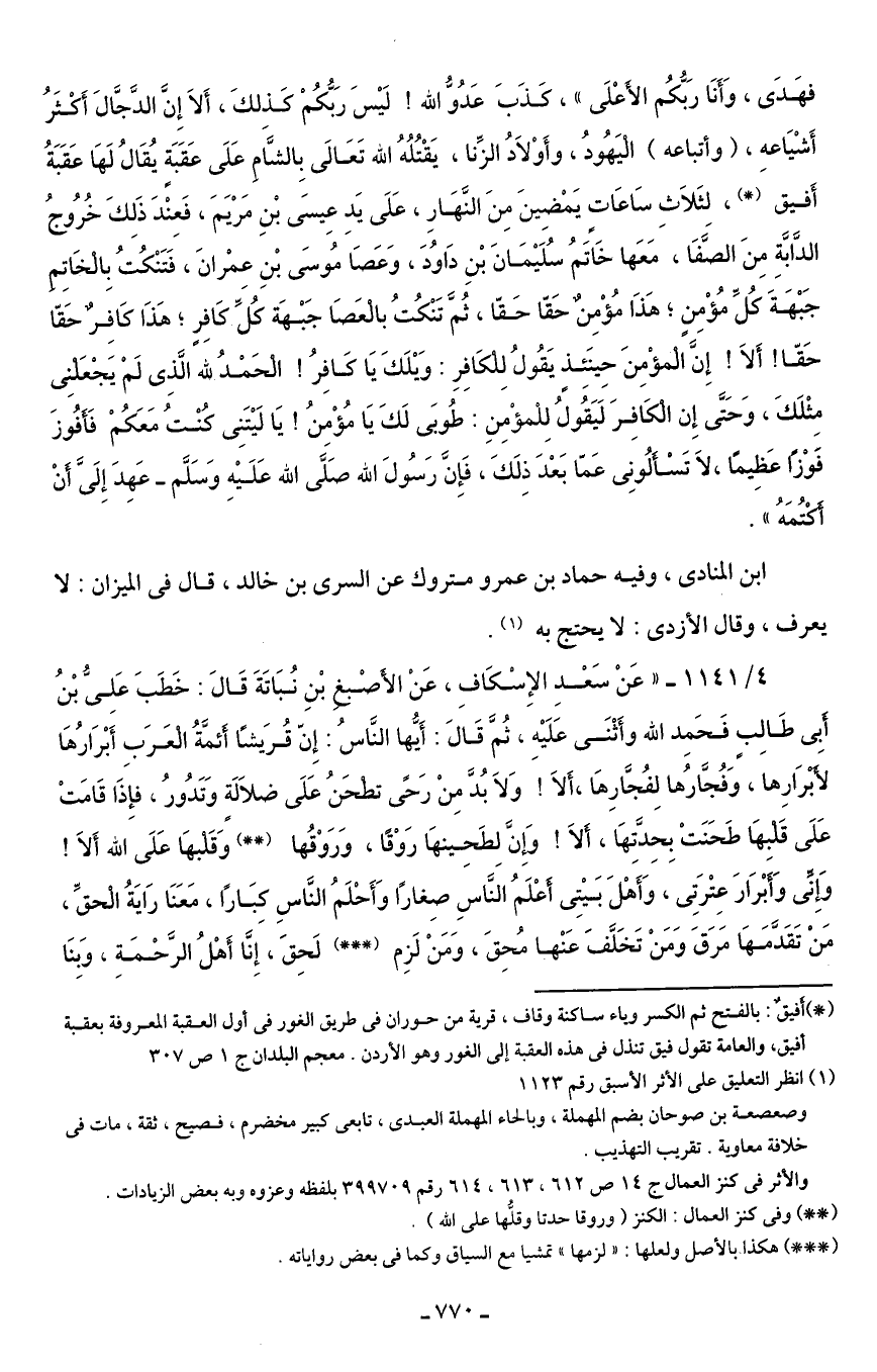 4/ 1141 - "عَنْ سَعْدِ الإِسْكَافِ، عَنْ الأَصْبغِ بْنِ نُبَاتَةَ قَالَ: خَطَبَ عَلِىُّ بْنُ أَبِى طَالِبٍ فَحَمِد الله وأَثْنَى عَلَيْهِ، ثُمَّ قَالَ: أَيُّها النَّاسُ: إِنّ قُرَيشًا أَئمَّةُ الْعَرَبِ أَبْرَارهُا لأَبْرَارِها، وَفُجَّارهُا لِفُجَّارِهَا، أَلَا! وَلاَ بُدَّ مِنْ رَحًى تطْحَنُ عَلَى ضلاَلَةٍ وَتَدُورُ، فإِذَا قَامَتْ عَلَى قَلْبِها طَحَنَتْ بِحِدَّتهَا، أَلاَ! وَإنَّ لِطَحِينهَا رَوْقًا، وَرَوْقُها (* *) وَقَلْبهَا عَلَى الله أَلاَ! وَإِنِّى وَأَبْرَارَ عِتْرَتِى، وَأَهْلَ بَيْتِى أَعْلَمُ النَّاسِ صِغارًا وَأَحْلَمُ النَّاسِ كِبَارًا، مَعَنَا رَايَةُ الْحقِّ، مَنْ تَقَدَّمَهَا مَرَقَ وَمَنْ تَخَلَّفَ عَنْها مُحِقَ، وَمَنْ لَزِم (* * *) لَحِقَ، إِنَّا أَهْلُ الرَّحْمَةِ، وَبِنَا